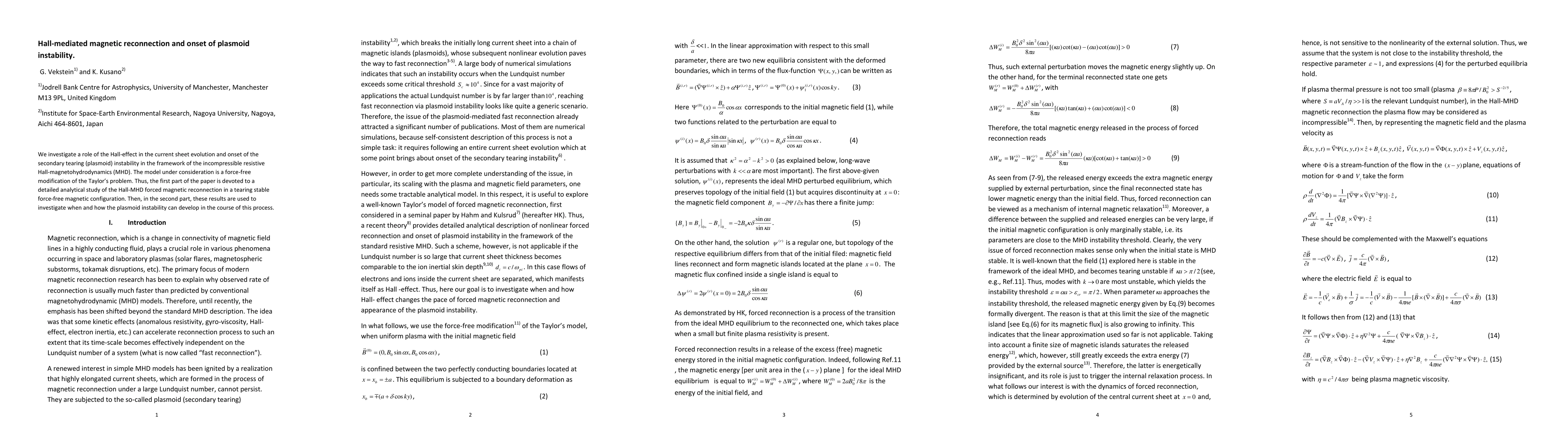 We investigate a role of the Hall-effect in the current sheet evolution and onset of the secondary tearing (plasmoid) instability in the framework of the incompressible resistive Hall-magnetohydrodynamics (MHD). The model under consideration is a force-free modification of the Taylor's problem. Thus, the first part of the paper is devoted to a detailed analytical study of the Hall-MHD forced magnetic reconnection in a tearing stable force-free magnetic configuration. Then, in the second part, these results are used to investigate when and how the plasmoid instability can develop in the course of this process.