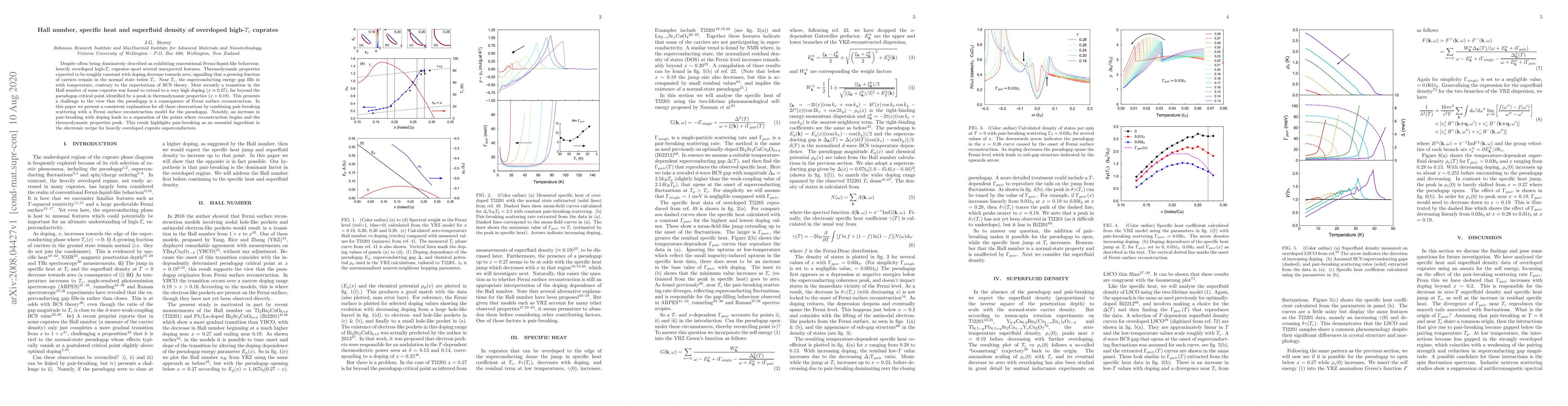 Despite often being dismissively described as exhibiting conventional Fermi-liquid-like behaviour, heavily overdoped high-Tc cuprates sport several unexpected features. Thermodynamic properties expected to be roughly constant with doping decrease towards zero, signalling that a growing fraction of carriers remain in the normal state below Tc. Near Tc, the superconducting energy gap fills in with temperature, contrary to the expectations of BCS theory. Most recently a transition in the Hall number of some cuprates was found to extend to a very high doping (x~0.27), far beyond the pseudogap critical point identified by a peak in thermodynamic properties (x=0.19). This presents a challenge to the view that the pseudogap is a consequence of Fermi surface reconstruction. In this paper we present a consistent explanation for all these observations by combining pair-breaking scattering with a Fermi surface reconstruction model for the pseudogap. Notably, an increase in pair-breaking with doping leads to a separation of the points where reconstruction begins and the thermodynamic properties peak. This result highlights pair-breaking as an essential ingredient in the electronic recipe for heavily overdoped cuprate superconductors.