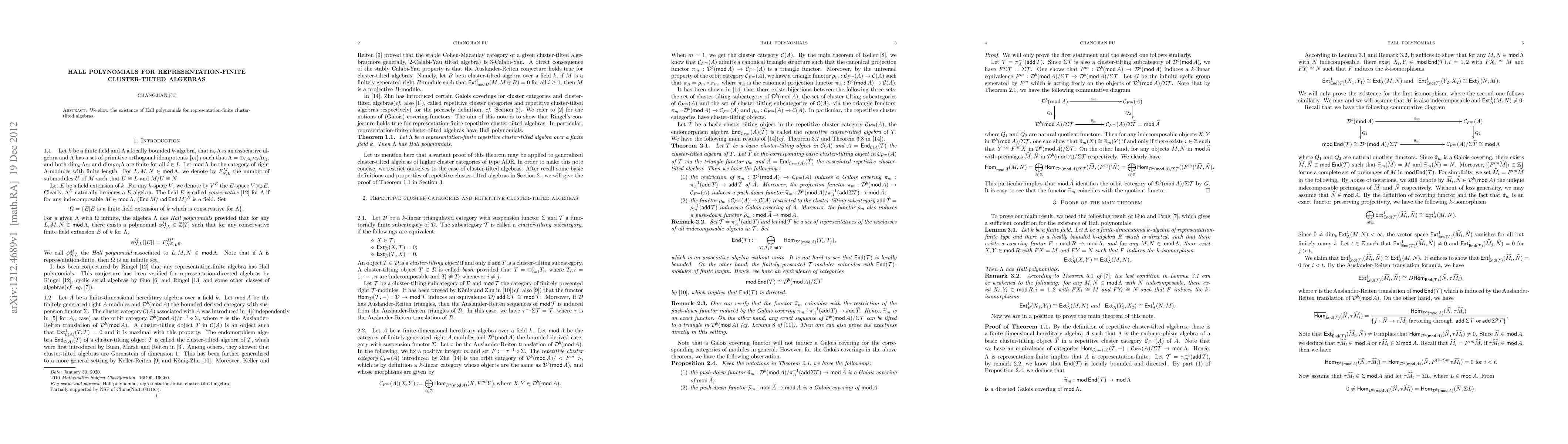 Summary: This paper establishes the existence of Hall polynomials for representation-finite cluster-tilted algebras, providing a significant advancement in understanding their representation theory. The findings contribute to the broader field of algebraic structures and their applications.