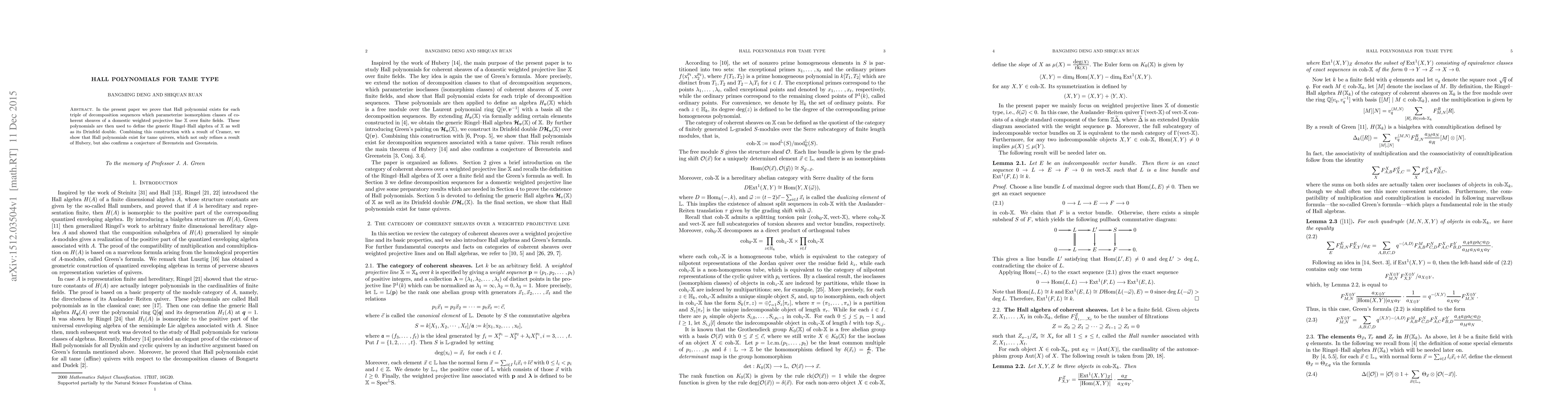 In the present paper we prove that Hall polynomial exists for each triple of decomposition sequences which parameterize isomorphism classes of coherent sheaves of a domestic weighted projective line $\mathbb X$ over finite fields. These polynomials are then used to define the generic Ringel--Hall algebra of $\mathbb X$ as well as its Drinfeld double. Combining this construction with a result of Cramer, we show that Hall polynomials exist for tame quivers, which not only refines a result of Hubery, but also confirms a conjecture of Berenstein and Greenstein.