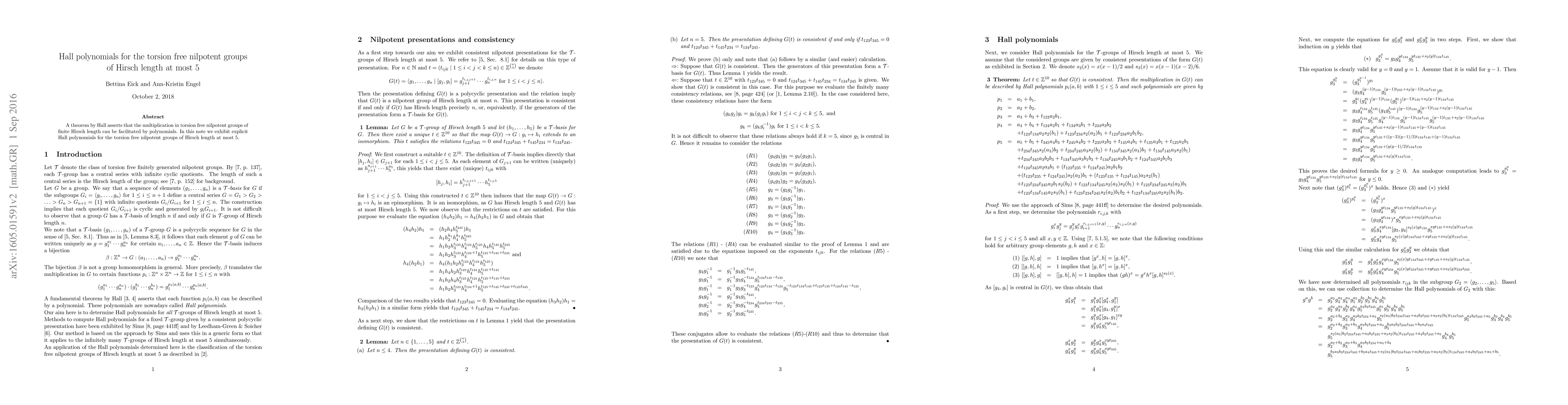 A theorem by Hall asserts that the multiplication in torsion free nilpotent groups of finite Hirsch length can be facilitated by polynomials. In this note we exhibit explicit Hall polynomials for the torsion free nilpotent groups of Hirsch length at most 5.