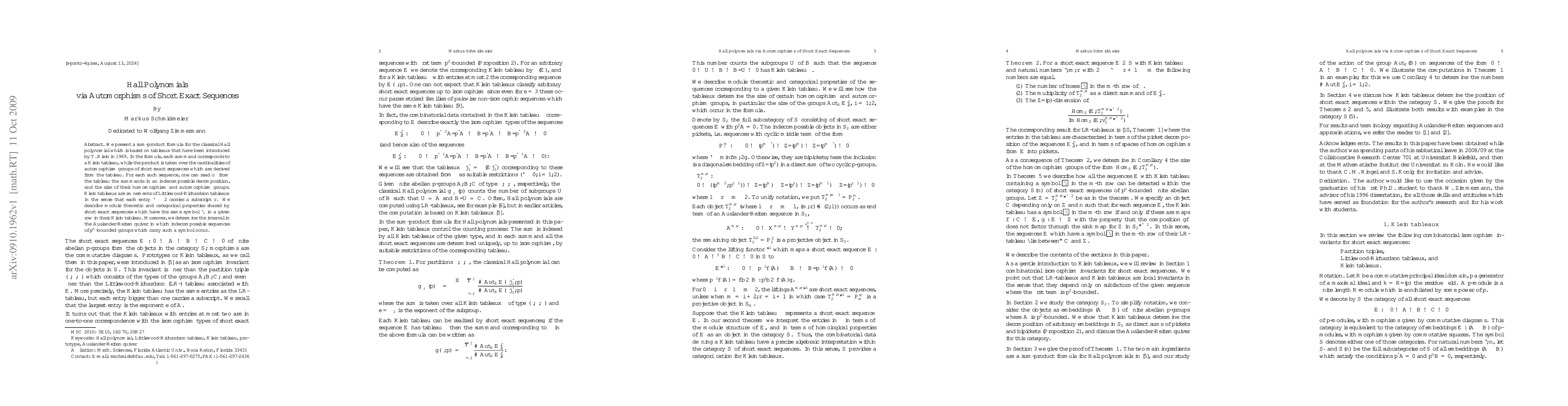 We present a sum-product formula for the classical Hall polynomial which is based on tableaux that have been introduced by T. Klein in 1969. In the formula, each summand corresponds to a Klein tableau, while the product is taken over the cardinalities of automorphism groups of short exact sequences which are derived from the tableau. For each such sequence, one can read off from the tableau the summands in an indecomposable decomposition, and the size of their homomorphism and automorphism groups. Klein tableaux are refinements of Littlewood-Richardson tableaux in the sense that each entry $\ell \geq 2$ carries a subscript $r$. We describe module theoretic and categorical properties shared by short exact sequences which have the same symbol $\ell_r$ in a given row in their Klein tableau. Moreover, we determine the interval in the Auslander-Reiten quiver in which indecomposable sequences of $p^n$-bounded groups which carry such a symbol occur.