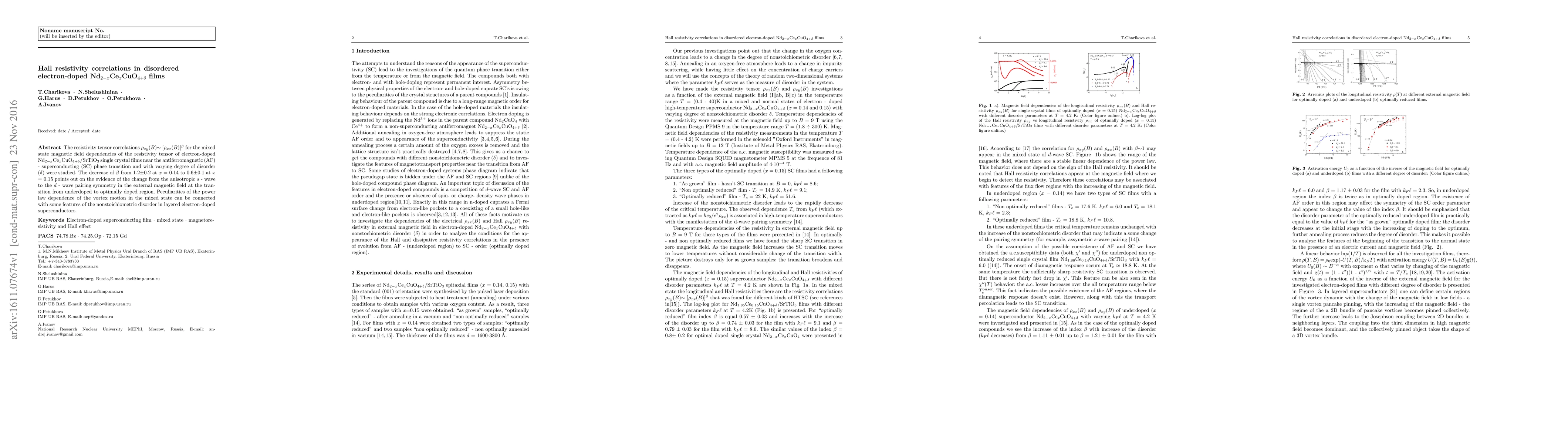 This study investigates the Hall resistivity correlations in electron-doped Nd$_{2-x}$Ce$_x$CuO$_{4+\delta}$ films, revealing a shift in pairing symmetry from anisotropic $s$ wave to $d$ wave as doping changes, evidenced by the decrease in $\beta$ from 1.2 to 0.6. The findings link the power law dependence of vortex motion to the nonstoichiometric disorder in the superconducting films.