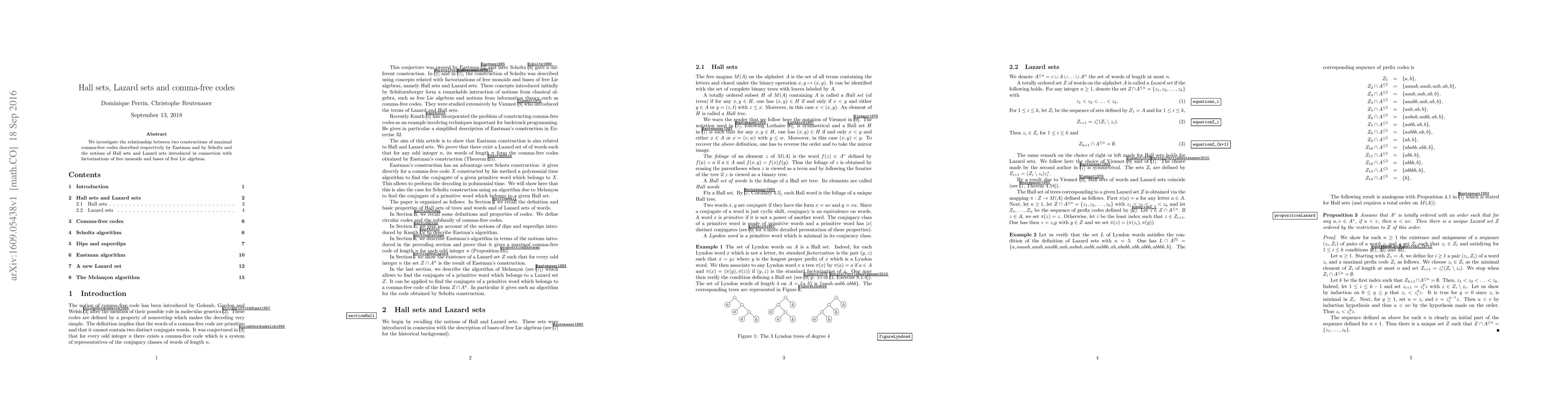 We investigate the relationship between two constructions of maximal comma-free codes described respectively by Eastman and by Scholtz and the notions of Hall sets and Lazard sets introduced in connection with factorizations of free monoids and bases of free Lie algebras.