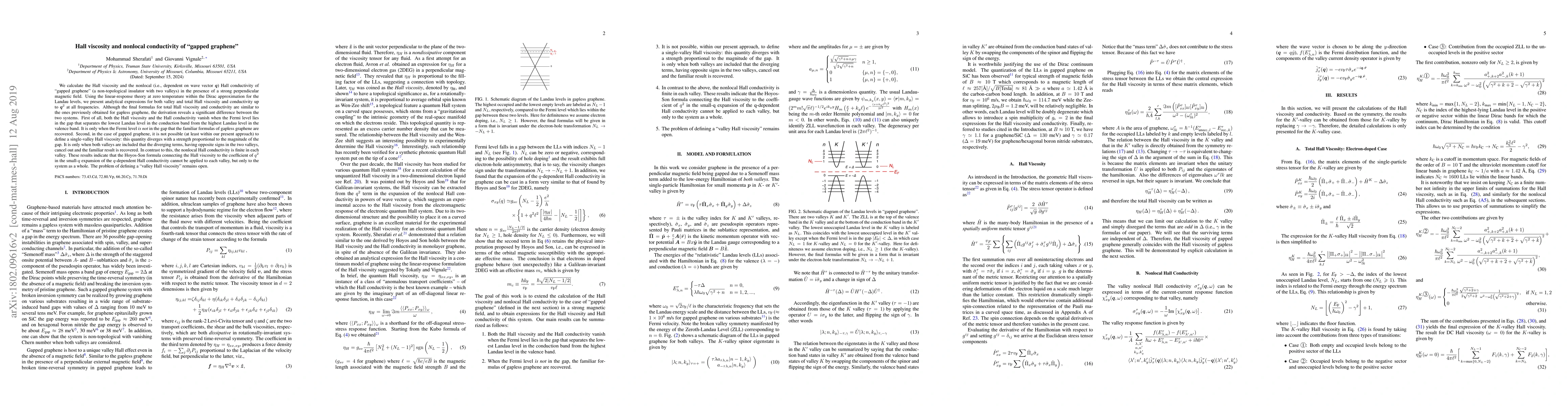 This paper investigates the Hall viscosity and nonlocal Hall conductivity of gapped graphene under a strong magnetic field, revealing that both vanish when the Fermi level lies within the bandgap. Unlike gapless graphene, gapped graphene's Hall viscosity diverges in single valleys but cancels out when both valleys are considered. Nonlocal Hall conductivity remains finite in each valley, challenging the application of the Hoyos-Son formula to individual valleys.