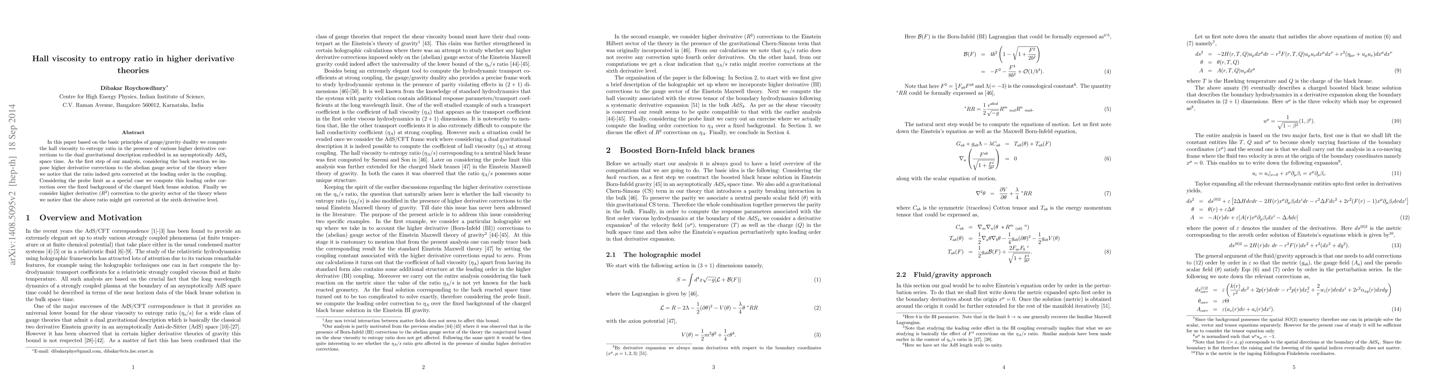 This paper computes the hall viscosity to entropy ratio in higher derivative theories using gauge/gravity duality, finding corrections to the ratio at the leading order in the coupling due to higher derivative terms in the abelian gauge sector. It also examines the sixth derivative level correction from higher derivative ($R^2$) gravity corrections in an asymptotically $AdS_4$ space-time.