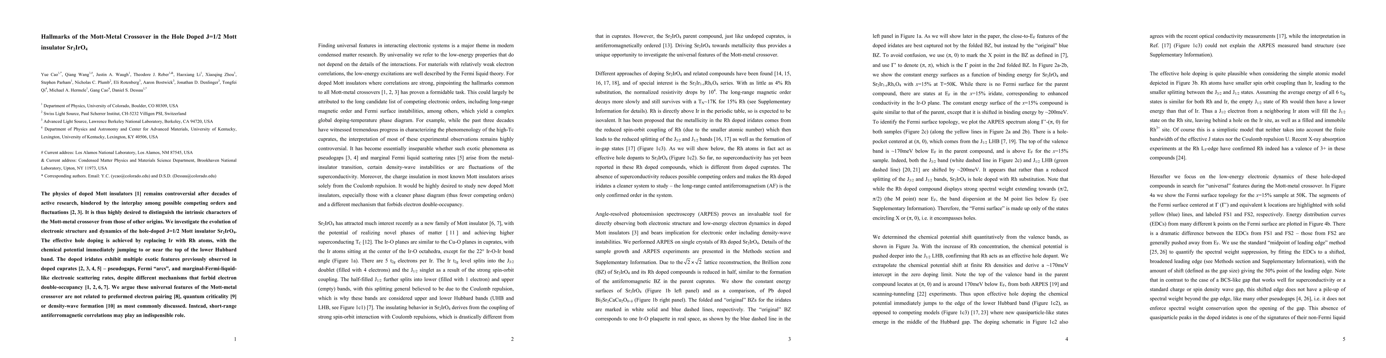 The physics of doped Mott insulators remains controversial after decades of active research, hindered by the interplay among possible competing orders and fluctuations. It is thus highly desired to distinguish the intrinsic characters of the Mott-metal crossover from those of other origins. We investigate the evolution of electronic structure and dynamics of the hole-doped J=1/2 Mott insulator Sr2IrO4. The effective hole doping is achieved by replacing Ir with Rh atoms, with the chemical potential immediately jumping to or near the top of the lower Hubbard band. The doped iridates exhibit multiple exotic features previously observed in doped cuprates - pseudogaps, Fermi "arcs", and marginal-Fermi-liquid-like electronic scattering rates, despite different mechanisms that forbid electron double-occupancy. We argue these universal features of the Mott-metal crossover are not related to preformed electron pairing, quantum criticality or density-wave formation as most commonly discussed. Instead, short-range antiferromagnetic correlations may play an indispensible role.