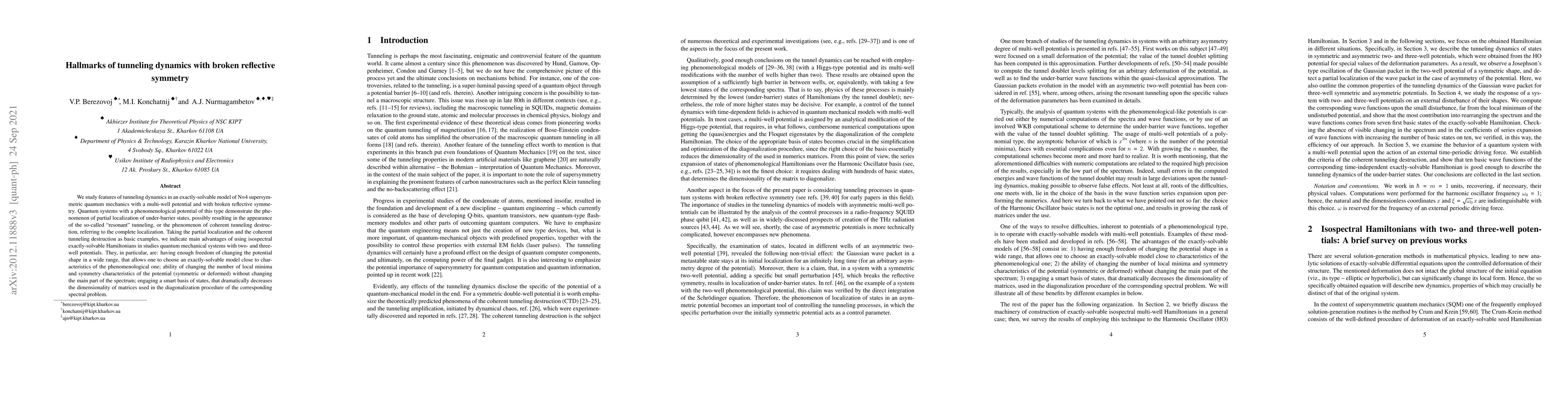 This paper investigates tunneling dynamics in N=4 supersymmetric quantum mechanics with a multi-well potential and broken reflective symmetry, highlighting phenomena like partial localization and coherent tunneling destruction. It demonstrates the utility of isospectral exactly-solvable Hamiltonians in modeling such systems, emphasizing their flexibility in potential shape and dimensionality reduction.