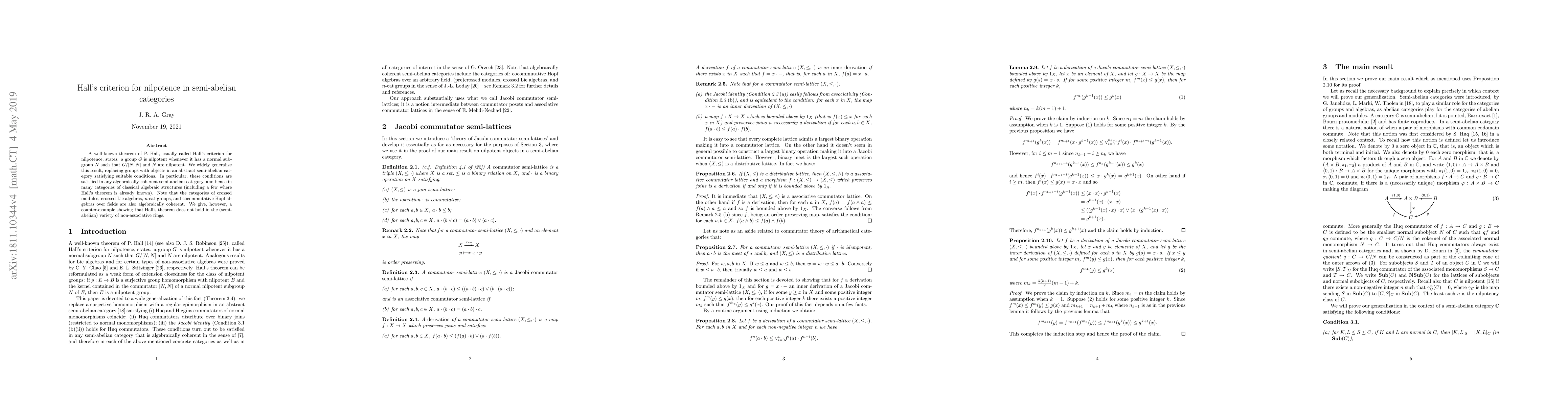 A well-known theorem of P. Hall, usually called Hall's criterion for nilpotence, states: a group G is nilpotent whenever it has a normal subgroup N such that G/[N,N] and N are nilpotent. We widely generalize this result, replacing groups with objects in an abstract semi-abelian category satisfying suitable conditions. In particular, these conditions are satisfied in any algebraically coherent semi-abelian category, and hence in many categories of classical algebraic structures (including a few where Hall's theorem is already known). Note that the categories of crossed modules, crossed Lie algebras, n-cat groups, and cocommutative Hopf algebras over fields are also algebraically coherent. We give, however, a counter-example showing that Hall's theorem does not hold in the (semi-abelian) variety of non-associative rings.