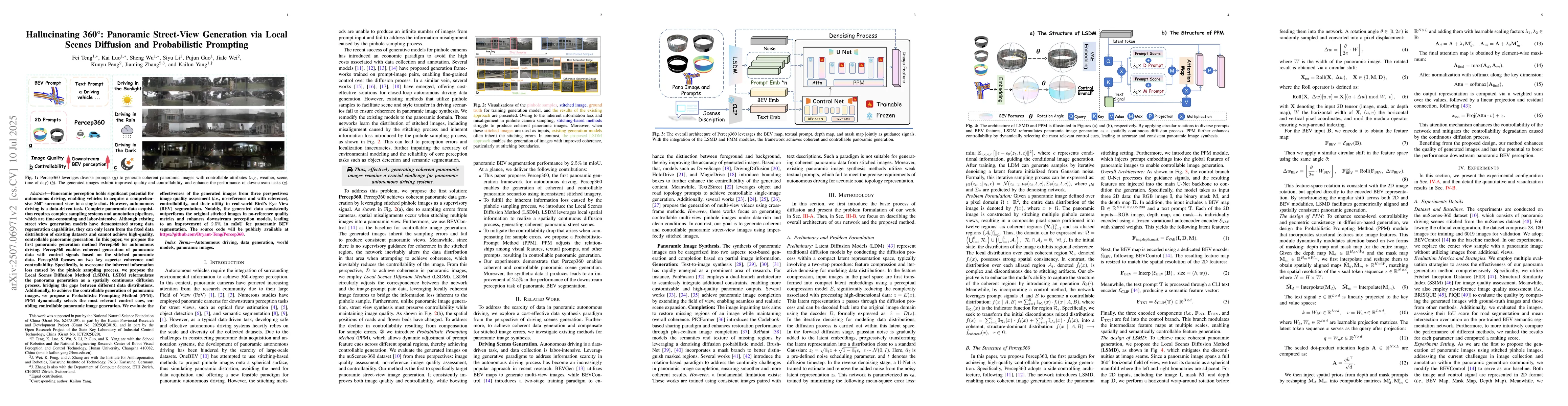 Panoramic perception holds significant potential for autonomous driving, enabling vehicles to acquire a comprehensive 360{\deg} surround view in a single shot. However, autonomous driving is a data-driven task. Complete panoramic data acquisition requires complex sampling systems and annotation pipelines, which are time-consuming and labor-intensive. Although existing street view generation models have demonstrated strong data regeneration capabilities, they can only learn from the fixed data distribution of existing datasets and cannot achieve high-quality, controllable panoramic generation. In this paper, we propose the first panoramic generation method Percep360 for autonomous driving. Percep360 enables coherent generation of panoramic data with control signals based on the stitched panoramic data. Percep360 focuses on two key aspects: coherence and controllability. Specifically, to overcome the inherent information loss caused by the pinhole sampling process, we propose the Local Scenes Diffusion Method (LSDM). LSDM reformulates the panorama generation as a spatially continuous diffusion process, bridging the gaps between different data distributions. Additionally, to achieve the controllable generation of panoramic images, we propose a Probabilistic Prompting Method (PPM). PPM dynamically selects the most relevant control cues, enabling controllable panoramic image generation. We evaluate the effectiveness of the generated images from three perspectives: image quality assessment (i.e., no-reference and with reference), controllability, and their utility in real-world Bird's Eye View (BEV) segmentation. Notably, the generated data consistently outperforms the original stitched images in no-reference quality metrics and enhances downstream perception models. The source code will be publicly available at https://github.com/Bryant-Teng/Percep360.