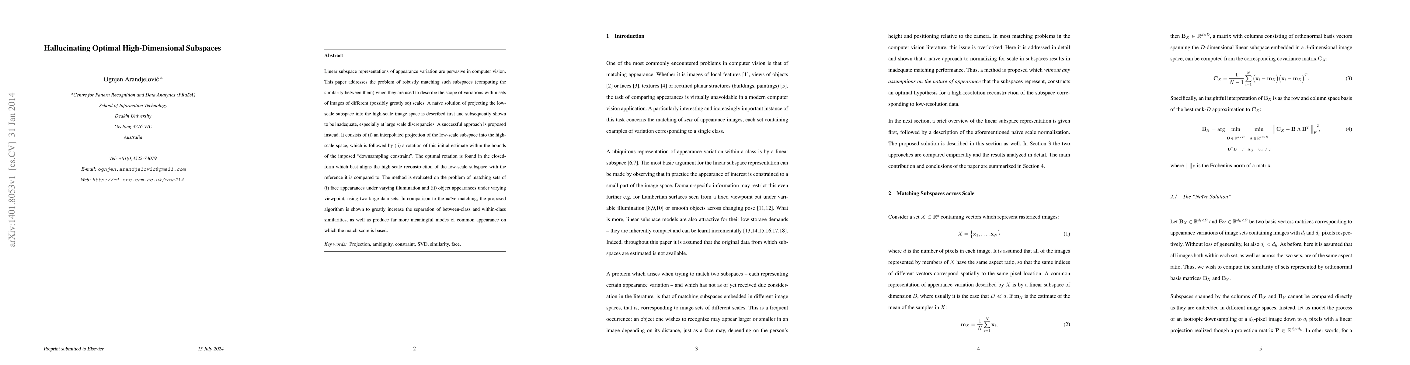 Linear subspace representations of appearance variation are pervasive in computer vision. This paper addresses the problem of robustly matching such subspaces (computing the similarity between them) when they are used to describe the scope of variations within sets of images of different (possibly greatly so) scales. A naive solution of projecting the low-scale subspace into the high-scale image space is described first and subsequently shown to be inadequate, especially at large scale discrepancies. A successful approach is proposed instead. It consists of (i) an interpolated projection of the low-scale subspace into the high-scale space, which is followed by (ii) a rotation of this initial estimate within the bounds of the imposed ``downsampling constraint''. The optimal rotation is found in the closed-form which best aligns the high-scale reconstruction of the low-scale subspace with the reference it is compared to. The method is evaluated on the problem of matching sets of (i) face appearances under varying illumination and (ii) object appearances under varying viewpoint, using two large data sets. In comparison to the naive matching, the proposed algorithm is shown to greatly increase the separation of between-class and within-class similarities, as well as produce far more meaningful modes of common appearance on which the match score is based.