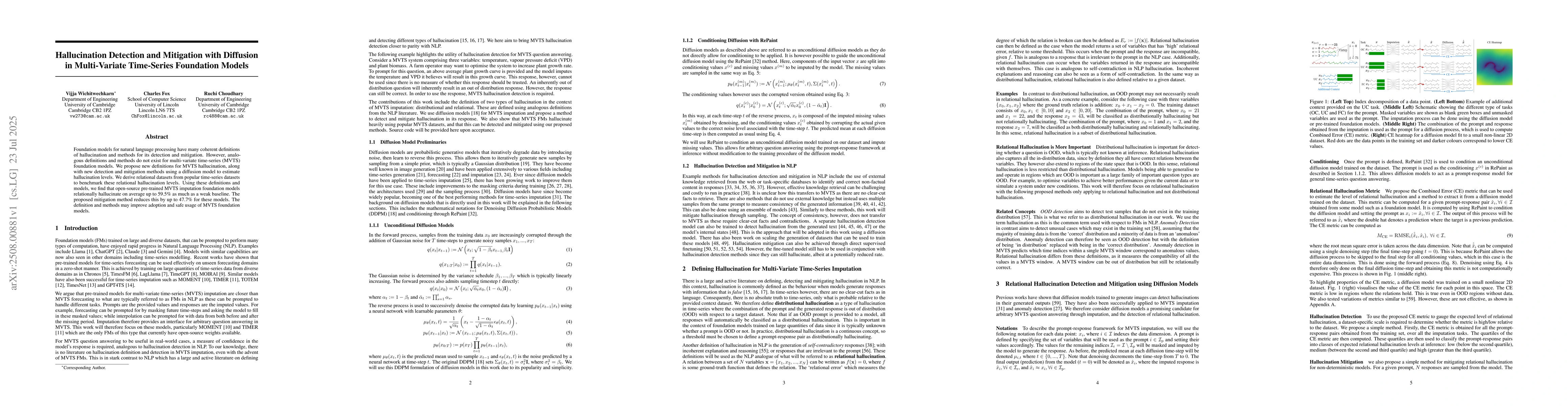 Foundation models for natural language processing have many coherent definitions of hallucination and methods for its detection and mitigation. However, analogous definitions and methods do not exist for multi-variate time-series (MVTS) foundation models. We propose new definitions for MVTS hallucination, along with new detection and mitigation methods using a diffusion model to estimate hallucination levels. We derive relational datasets from popular time-series datasets to benchmark these relational hallucination levels. Using these definitions and models, we find that open-source pre-trained MVTS imputation foundation models relationally hallucinate on average up to 59.5% as much as a weak baseline. The proposed mitigation method reduces this by up to 47.7% for these models. The definition and methods may improve adoption and safe usage of MVTS foundation models.