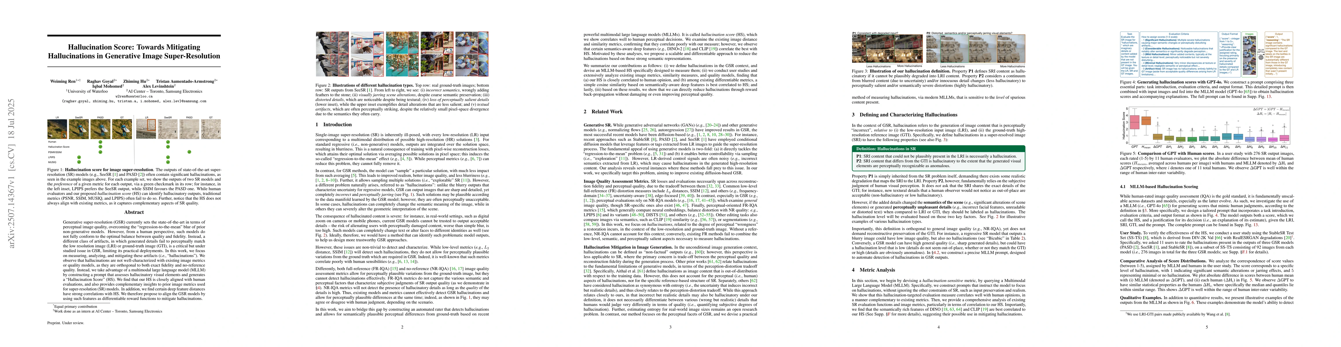 Generative super-resolution (GSR) currently sets the state-of-the-art in terms of perceptual image quality, overcoming the "regression-to-the-mean" blur of prior non-generative models. However, from a human perspective, such models do not fully conform to the optimal balance between quality and fidelity. Instead, a different class of artifacts, in which generated details fail to perceptually match the low resolution image (LRI) or ground-truth image (GTI), is a critical but under studied issue in GSR, limiting its practical deployments. In this work, we focus on measuring, analyzing, and mitigating these artifacts (i.e., "hallucinations"). We observe that hallucinations are not well-characterized with existing image metrics or quality models, as they are orthogonal to both exact fidelity and no-reference quality. Instead, we take advantage of a multimodal large language model (MLLM) by constructing a prompt that assesses hallucinatory visual elements and generates a "Hallucination Score" (HS). We find that our HS is closely aligned with human evaluations, and also provides complementary insights to prior image metrics used for super-resolution (SR) models. In addition, we find certain deep feature distances have strong correlations with HS. We therefore propose to align the GSR models by using such features as differentiable reward functions to mitigate hallucinations.