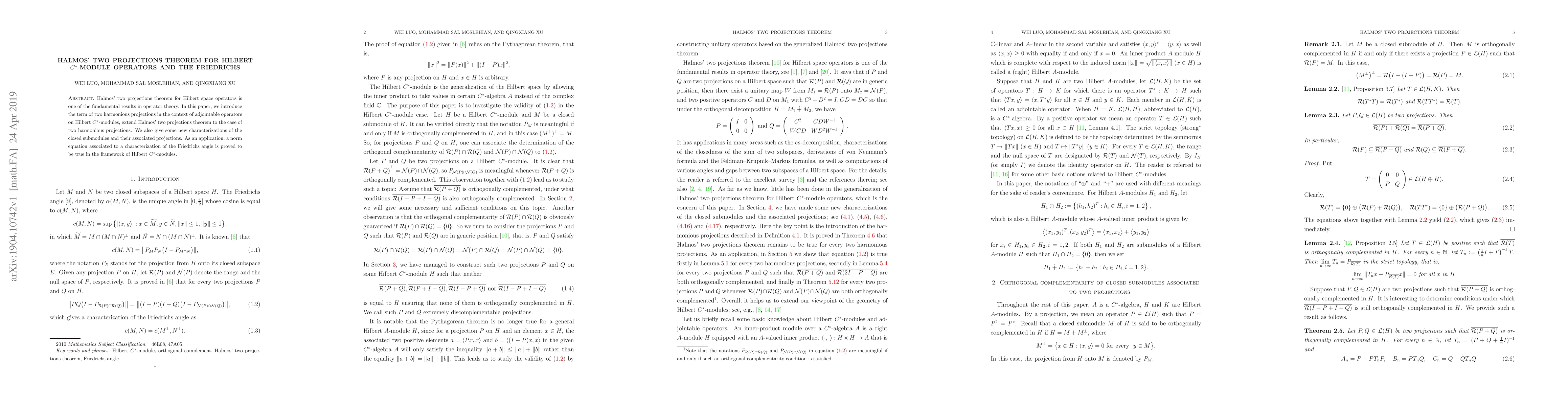 Summary: This paper extends Halmos' two projections theorem to Hilbert $C^*$-modules, introducing the concept of harmonious projections for adjointable operators, providing new characterizations of closed submodules, and proving a norm equation related to the Friedrichs angle within this module framework.