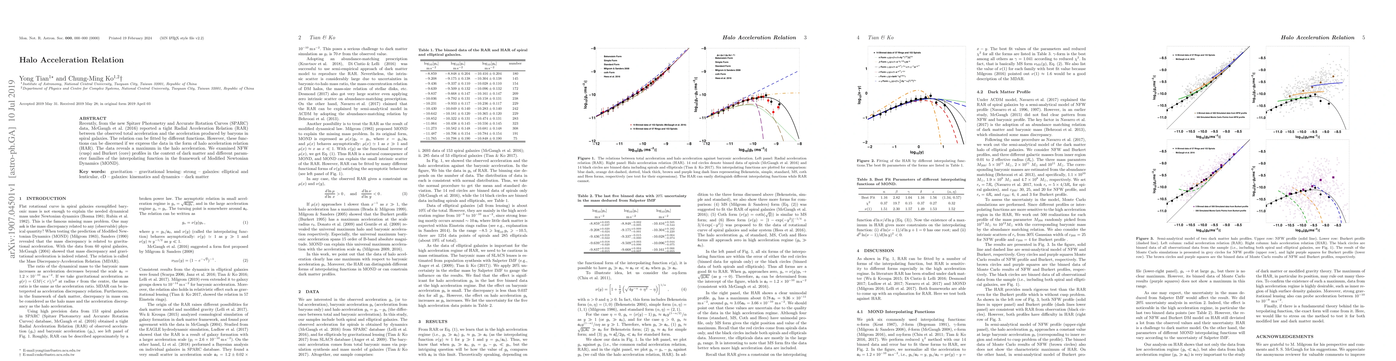 Recently, from the new Spitzer Photometry and Accurate Rotation Curves (SPARC) data, McGaugh et al. (2016) reported a tight Radial Acceleration Relation (RAR) between the observed total acceleration and the acceleration produced by baryons in spiral galaxies. The relation can be fitted by different functions. However, these functions can be discerned if we express the data in the form of halo acceleration relation (HAR). The data reveals a maximum in the halo acceleration. We examined NFW (cusp) and Burkert (core) profiles in the context of dark matter and different parameter families of the interpolating function in the framework of Modified Newtonian Dynamics (MOND).