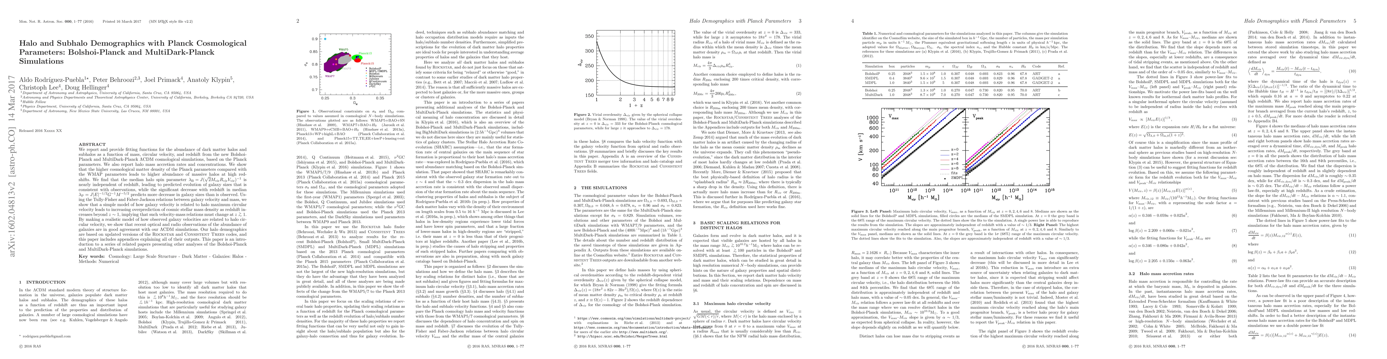 This paper presents the demographics of dark matter halos and subhalos from the Bolshoi-Planck and MultiDark-Planck simulations, based on Planck cosmological parameters, and provides fitting functions for their abundance and mass accretion rates. It highlights discrepancies in galaxy size evolution predictions and suggests that galaxy velocity-mass relations must change at high redshifts.