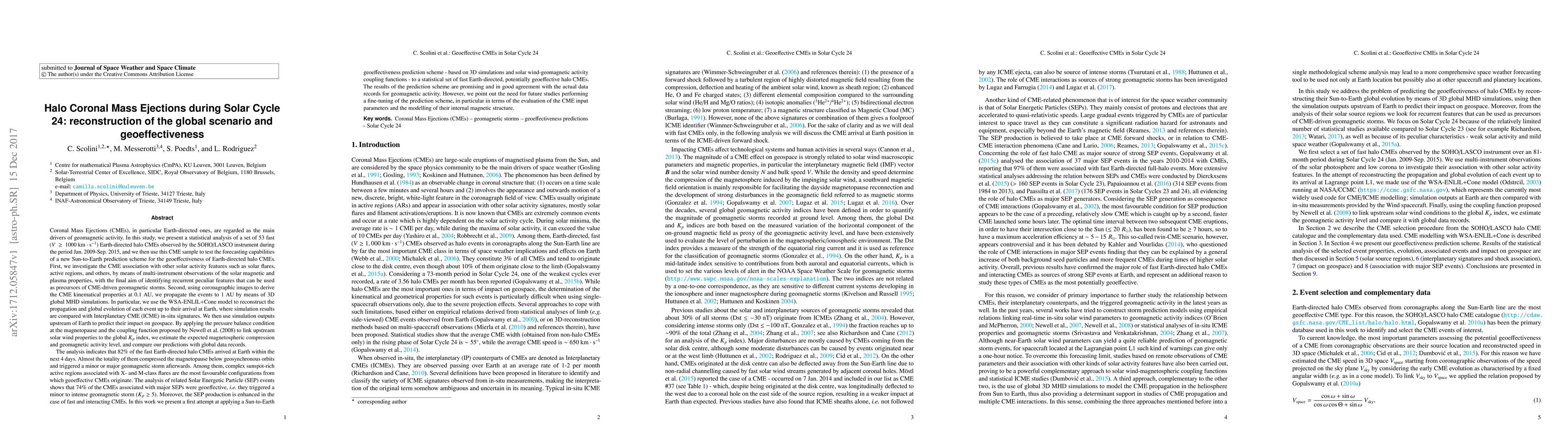In this study we present a statistical analysis of 53 fast Earth-directed halo CMEs observed by the SOHO/LASCO instrument during the period Jan. 2009-Sep. 2015, and we use this CME sample to test the capabilities of a Sun-to-Earth prediction scheme for CME geoeffectiveness. First, we investigate the CME association with other solar activity features by means of multi-instrument observations of the solar magnetic and plasma properties. Second, using coronagraphic images to derive the CME kinematical properties at 0.1 AU, we propagate the events to 1 AU by means of the WSA-ENLIL+Cone model. Simulation results at Earth are compared with in-situ observations at L1. By applying the pressure balance condition at the magnetopause and a solar wind-Kp index coupling function, we estimate the expected magnetospheric compression and geomagnetic activity level, and compare them with global data records. The analysis indicates that 82% of the CMEs arrived at Earth in the next 4 days. Almost the totality of them compressed the magnetopause below geosynchronous orbits and triggered a geomagnetic storm. Complex sunspot-rich active regions associated with energetic flares result the most favourable configurations from which geoeffective CMEs originate. The analysis of related SEP events shows that 74% of the CMEs associated with major SEPs were geoeffective. Moreover, the SEP production is enhanced in the case of fast and interacting CMEs. In this work we present a first attempt at applying a Sun-to-Earth geoeffectiveness prediction scheme - based on 3D simulations and solar wind-geomagnetic activity coupling functions - to a statistical set of potentially geoeffective halo CMEs. The results of the prediction scheme are in good agreement with geomagnetic activity data records, although further studies performing a fine-tuning of such scheme are needed.