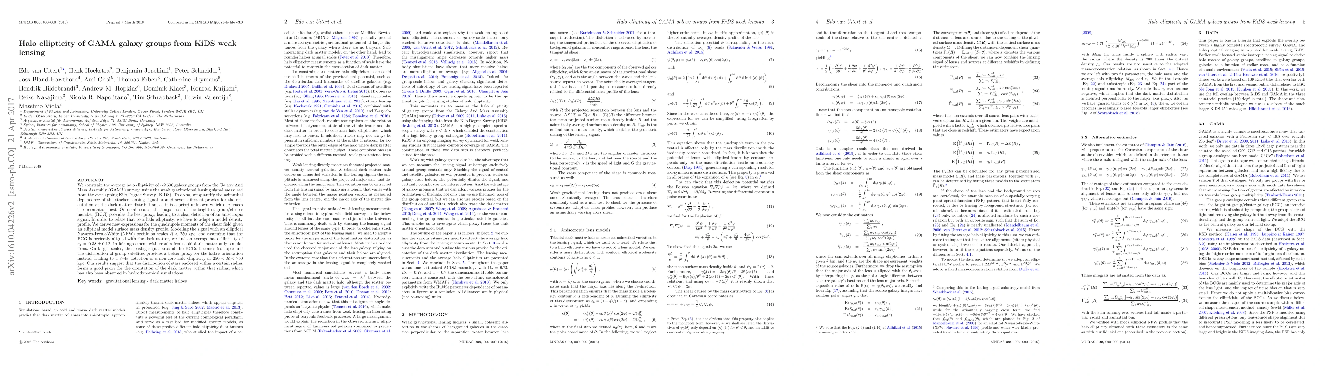 This research uses weak gravitational lensing from KiDS to constrain the average halo ellipticity of ~2600 galaxy groups in GAMA. They find an ellipticity (e_h) of 0.38±0.12 on small scales (<250 kpc) using the brightest cluster galaxy (BCG) major axis as proxy, consistent with simulations. On larger scales (250-750 kpc), satellite distribution better indicates halo orientation, revealing a non-zero halo ellipticity.