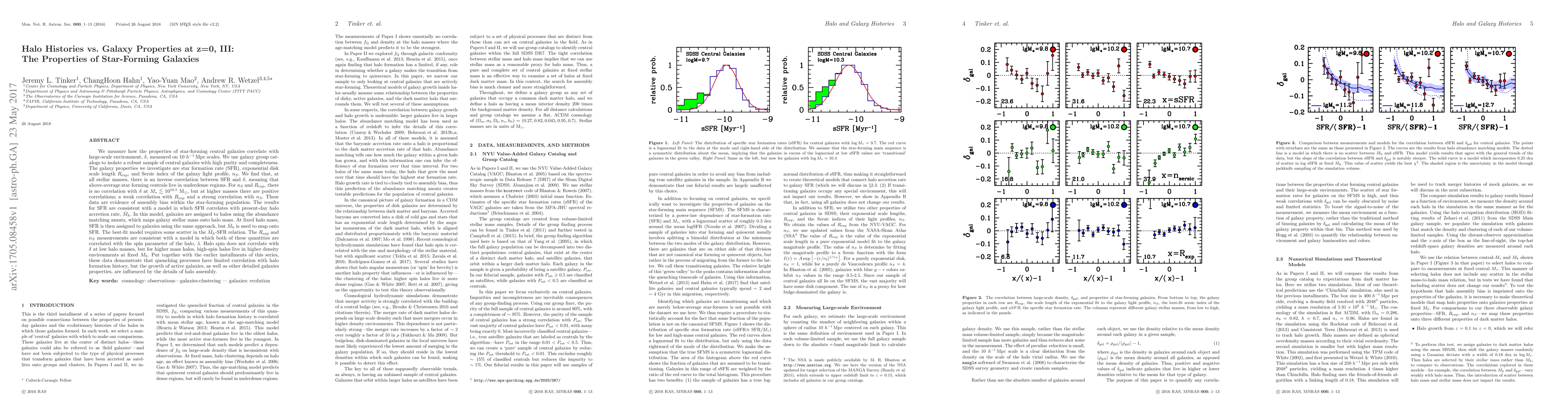 We measure how the properties of star-forming central galaxies correlate with large-scale environment, $\delta$, measured on $10$Mpc/h scales. We use group catalogs to isolate a robust sample of central galaxies with high purity and completeness. The properties we investigate are star formation rate (SFR), exponential disk scale length $R_{\rm exp}$, and Sersic index of the light profile, $n$. We find that, at all stellar masses, there is an inverse correlation between SFR and $\delta$, meaning that above-average star forming centrals live in underdense regions. For $n$ and $R_{\rm exp}$, there is no correlation with $\delta$ at $M_{\rm star}\lesssim 10^{10.5}$ $M_\odot$, but at higher masses there are positive correlations; a weak correlation with $R_{\rm exp}$ and a strong correlation with $n$. These data are evidence of assembly bias within the star-forming population. The results for SFR are consistent with a model in which SFR correlates with present-day halo accretion rate, $\dot{M}_h$. In this model, galaxies are assigned to halos using the abundance matching ansatz, which maps galaxy stellar mass onto halo mass. At fixed halo mass, SFR is assigned to galaxies using the same approach,but $\dot{M}_h$ is used to map onto SFR. The best-fit model requires some scatter in the $\dot{M}_h$-SFR relation. The $R_{\rm exp}$ and $n$ measurements are consistent with a model in which these quantities are correlated with the spin parameter of the halo, $\lambda$. Halo spin does not correlate with $\delta$ at low halo masses, but for higher mass halos, high-spin halos live in higher density environments at fixed $M_h$. Put together with the earlier installments of this series, these data demonstrate that quenching processes have limited correlation with halo formation history, but the growth of active galaxies, as well as other detailed properties, are influenced by the details of halo assembly.