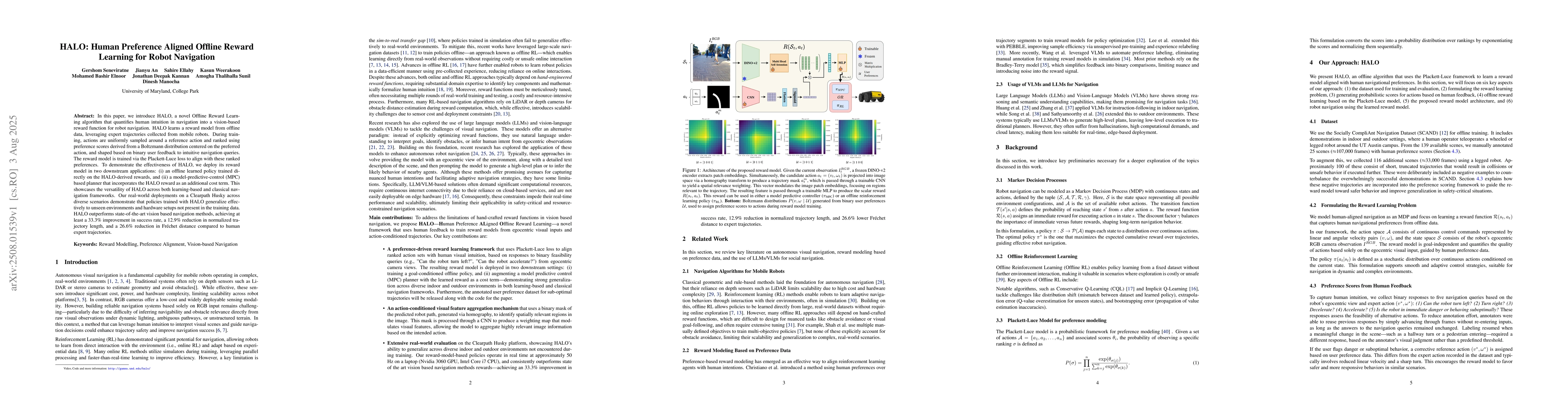 In this paper, we introduce HALO, a novel Offline Reward Learning algorithm that quantifies human intuition in navigation into a vision-based reward function for robot navigation. HALO learns a reward model from offline data, leveraging expert trajectories collected from mobile robots. During training, actions are uniformly sampled around a reference action and ranked using preference scores derived from a Boltzmann distribution centered on the preferred action, and shaped based on binary user feedback to intuitive navigation queries. The reward model is trained via the Plackett-Luce loss to align with these ranked preferences. To demonstrate the effectiveness of HALO, we deploy its reward model in two downstream applications: (i) an offline learned policy trained directly on the HALO-derived rewards, and (ii) a model-predictive-control (MPC) based planner that incorporates the HALO reward as an additional cost term. This showcases the versatility of HALO across both learning-based and classical navigation frameworks. Our real-world deployments on a Clearpath Husky across diverse scenarios demonstrate that policies trained with HALO generalize effectively to unseen environments and hardware setups not present in the training data. HALO outperforms state-of-the-art vision-based navigation methods, achieving at least a 33.3% improvement in success rate, a 12.9% reduction in normalized trajectory length, and a 26.6% reduction in Frechet distance compared to human expert trajectories.