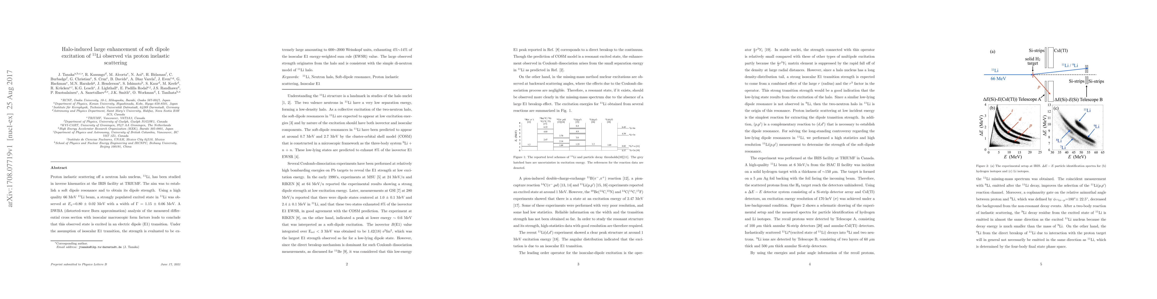 This study reveals a strongly enhanced soft dipole resonance in 11Li via proton inelastic scattering, indicating a large electric dipole excitation strength due to the neutron halo, consistent with the di-neutron model. The observed state exhausts 4% to 14% of the isoscalar E1 energy-weighted sum rule value.