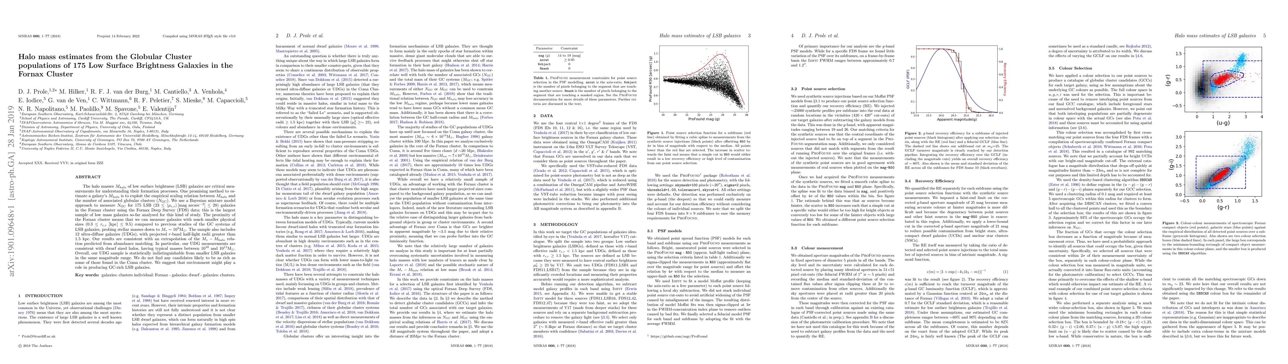 The halo masses $M_{halo}$ of low surface brightness (LSB) galaxies are critical measurements for understanding their formation processes. One promising method to estimate a galaxy's $M_{halo}$ is to exploit the empirical scaling relation between $M_{halo}$ and the number of associated globular clusters ($N_{\mathrm{GC}}$). We use a Bayesian mixture model approach to measure $N_{\mathrm{GC}}$ for 175 LSB ($23\leq\left\langle \mu_{e,r} \right\rangle [\mathrm{mag\ arcsec}^{-2}]\leq 28$) galaxies in the Fornax cluster using the Fornax Deep Survey (FDS) data; this is the largest sample of low mass galaxies so-far analysed for this kind of study. The proximity of the Fornax cluster means that we can measure galaxies with much smaller physical sizes ($0.3\leq r_{e,r}\ [\mathrm{kpc}]\leq 9.5$) compared to previous studies of the GC systems of LSB galaxies, probing stellar masses down to $M_{*}\sim10^{5}\mathrm{M_{\odot}}$. The sample also includes \nudg\ ultra-diffuse galaxies (UDGs), with projected $r$-band half-light radii greater than 1.5 kpc. Our results are consistent with an extrapolation of the $M_{*}-M_{halo}$ relation predicted from abundance matching. In particular, our UDG measurements are consistent with dwarf sized halos, having typical masses between $10^{10}$ and $10^{11}\mathrm{M_{\odot}}$. Overall, our UDG sample is statistically indistinguishable from smaller LSB galaxies in the same magnitude range. We do not find any candidates likely to be as rich as some of those found in the Coma cluster. We suggest that environment might play a role in producing GC-rich LSB galaxies.