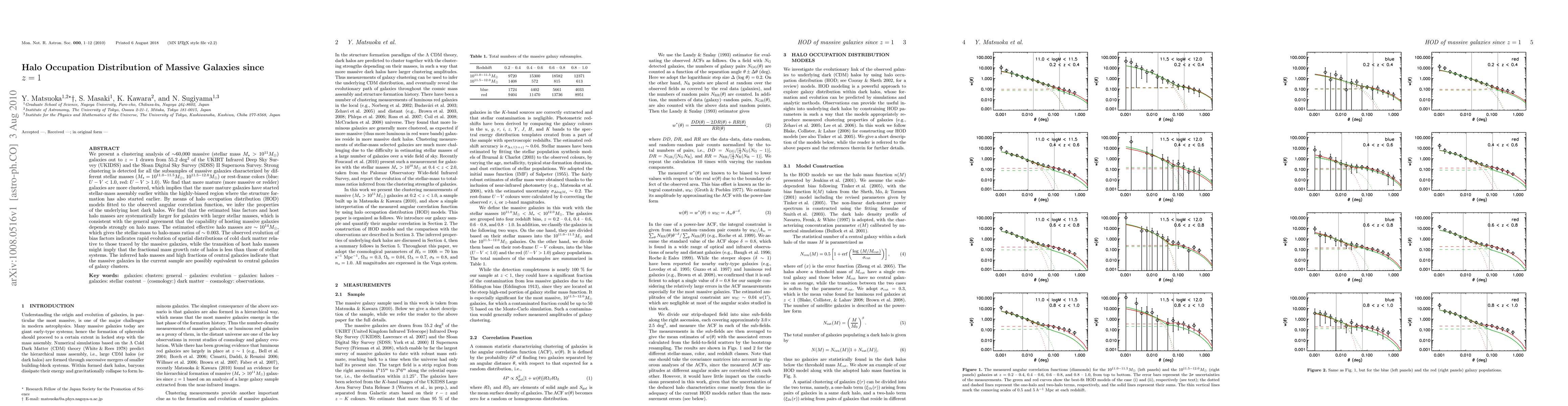 We present a clustering analysis of ~60,000 massive (stellar mass Mstar > 10^{11} Msun) galaxies out to z = 1 drawn from 55.2 deg2 of the UKIRT Infrared Deep Sky Survey (UKIDSS) and the Sloan Digital Sky Survey (SDSS) II Supernova Survey. Strong clustering is detected for all the subsamples of massive galaxies characterized by different stellar masses (Mstar = 10^{11.0-11.5} Msun, 10^{11.5-12.0} Msun) or rest-frame colors (blue: U - V < 1.0, red: U - V > 1.0). We find that more mature (more massive or redder) galaxies are more clustered, which implies that more mature galaxies have started stellar-mass assembly earlier within the highly-biased region where the structure formation has also started earlier. By means of halo occupation distribution (HOD) models fitted to the observed angular correlation function, we infer the properties of the underlying host dark halos. We find that the estimated bias factors and host halo masses are systematically larger for galaxies with larger stellar masses, which is consistent with the general agreement that the capability of hosting massive galaxies depends strongly on halo mass. The estimated effective halo masses are ~10^{14} Msun, which gives the stellar-mass to halo-mass ratios of ~0.003. The observed evolution of bias factors indicates rapid evolution of spatial distributions of cold dark matter relative to those traced by the massive galaxies, while the transition of host halo masses might imply that the fractional mass growth rate of halos is less than those of stellar systems. The inferred halo masses and high fractions of central galaxies indicate that the massive galaxies in the current sample are possibly equivalent to central galaxies of galaxy clusters.