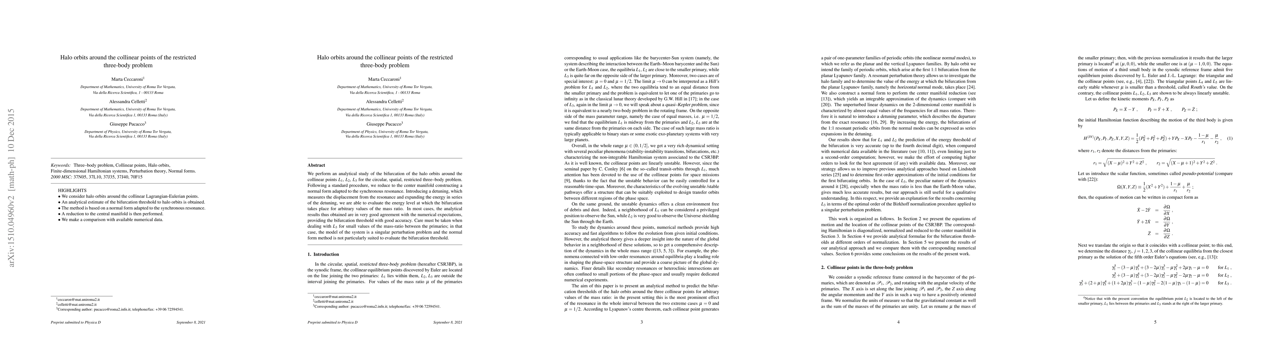We perform an analytical study of the bifurcation of the halo orbits around the collinear points $L_1$, $L_2$, $L_3$ for the circular, spatial, restricted three--body problem. Following a standard procedure, we reduce to the center manifold constructing a normal form adapted to the synchronous resonance. Introducing a detuning, which measures the displacement from the resonance and expanding the energy in series of the detuning, we are able to evaluate the energy level at which the bifurcation takes place for arbitrary values of the mass ratio. In most cases, the analytical results thus obtained are in very good agreement with the numerical expectations, providing the bifurcation threshold with good accuracy. Care must be taken when dealing with $L_3$ for small values of the mass-ratio between the primaries; in that case, the model of the system is a singular perturbation problem and the normal form method is not particularly suited to evaluate the bifurcation threshold.