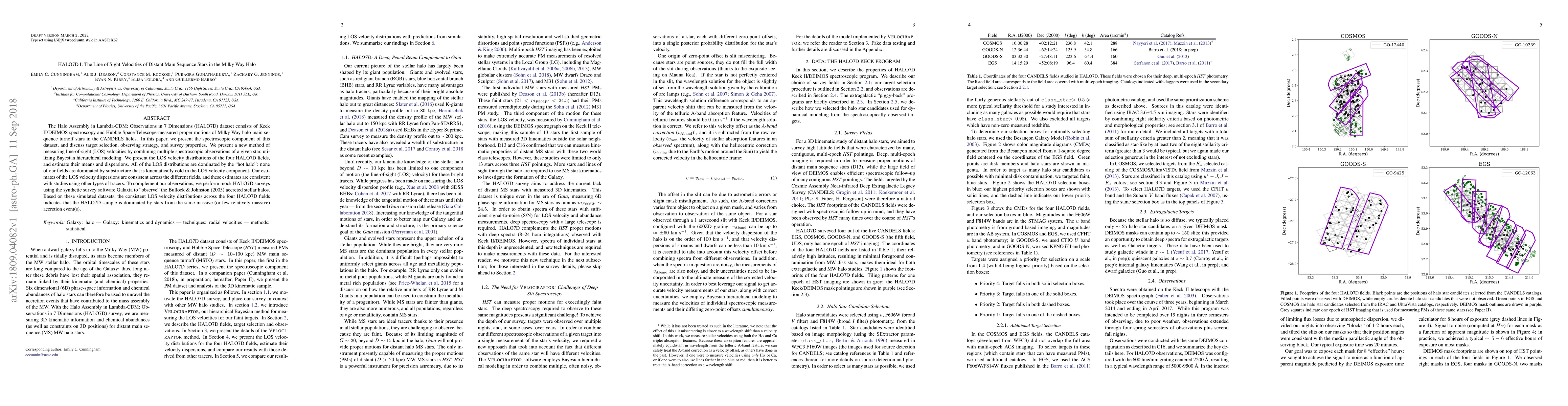 The Halo Assembly in Lambda-CDM: Observations in 7 Dimensions (HALO7D) dataset consists of Keck II/DEIMOS spectroscopy and Hubble Space Telescope-measured proper motions of Milky Way halo main sequence turnoff stars in the CANDELS fields. In this paper, we present the spectroscopic component of this dataset, and discuss target selection, observing strategy, and survey properties. We present a new method of measuring line-of-sight (LOS) velocities by combining multiple spectroscopic observations of a given star, utilizing Bayesian hierarchical modeling. We present the LOS velocity distributions of the four HALO7D fields, and estimate their means and dispersions. All of the LOS distributions are dominated by the "hot halo": none of our fields are dominated by substructure that is kinematically cold in the LOS velocity component. Our estimates of the LOS velocity dispersions are consistent across the different fields, and these estimates are consistent with studies using other types of tracers. To complement our observations, we perform mock HALO7D surveys using the synthetic survey software Galaxia to "observe'" the Bullock & Johnston (2005) accreted stellar halos. Based on these simulated datasets, the consistent LOS velocity distributions across the four HALO7D fields indicates that the HALO7D sample is dominated by stars from the same massive (or few relatively massive) accretion event(s).
