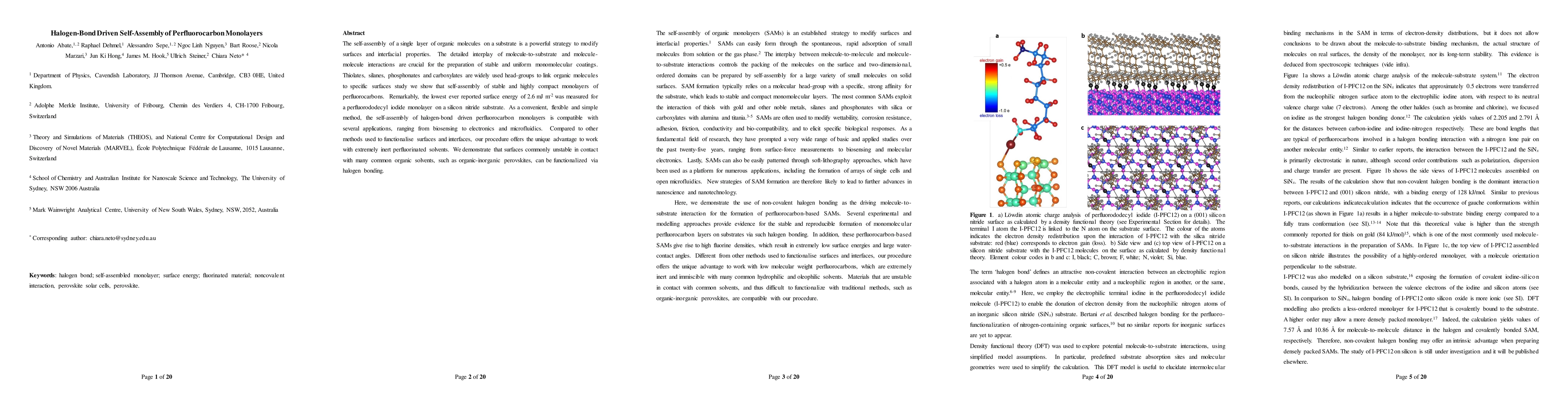 This paper demonstrates the self-assembly of highly stable perfluorocarbon monolayers driven by halogen bonding, achieving the lowest reported surface energy of 2.6 mJ m-2. This method is versatile and applicable across various fields, including biosensing, electronics, and microfluidics, due to its compatibility with inert perfluorinated solvents.