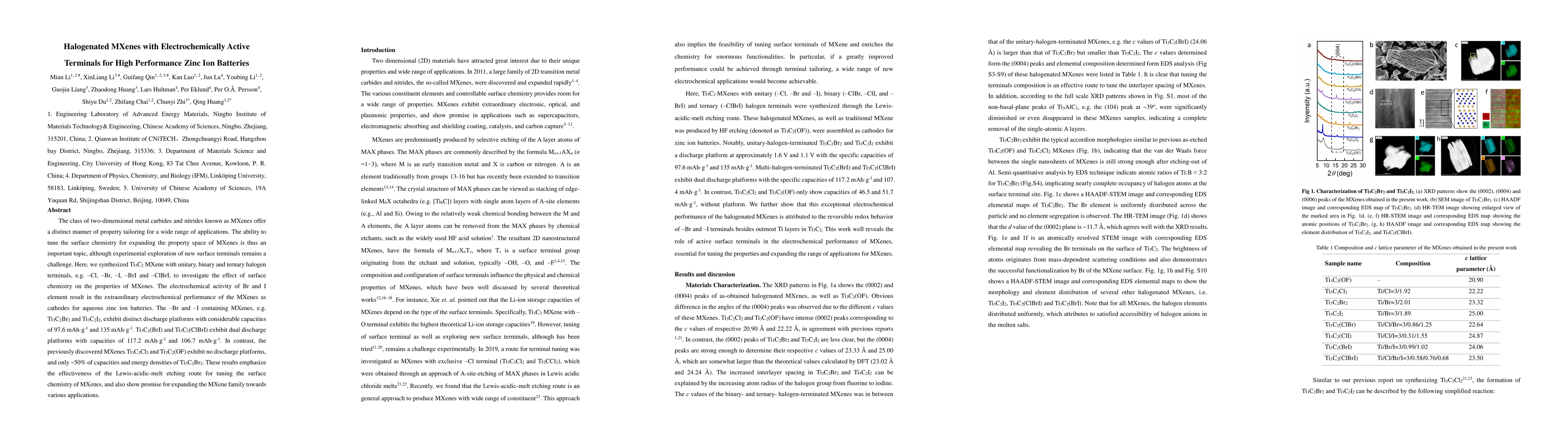 This paper synthesizes Ti3C2 MXenes with various halogen terminals to explore their electrochemical performance in zinc ion batteries. The MXenes with -Br and -I terminals, such as Ti3C2Br2 and Ti3C2I2, exhibit high capacities, demonstrating the potential of halogenated MXenes for advanced battery applications.