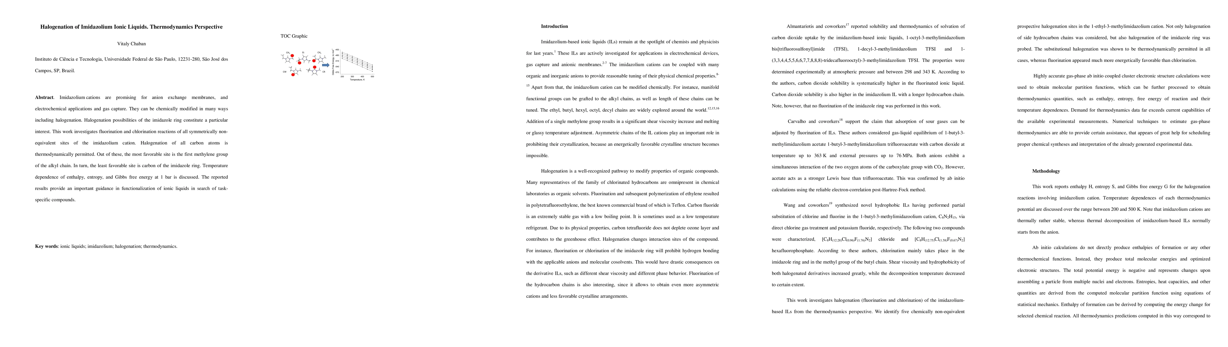 This study explores the thermodynamics of fluorination and chlorination of imidazolium ionic liquids, revealing that halogenation of all carbon atoms is thermodynamically feasible, with the first methylene group in the alkyl chain being the most favorable site. The least favorable site is the carbon on the imidazole ring, with the temperature dependence of enthalpy, entropy, and Gibbs free energy analyzed for practical guidance in ionic liquid functionalization.