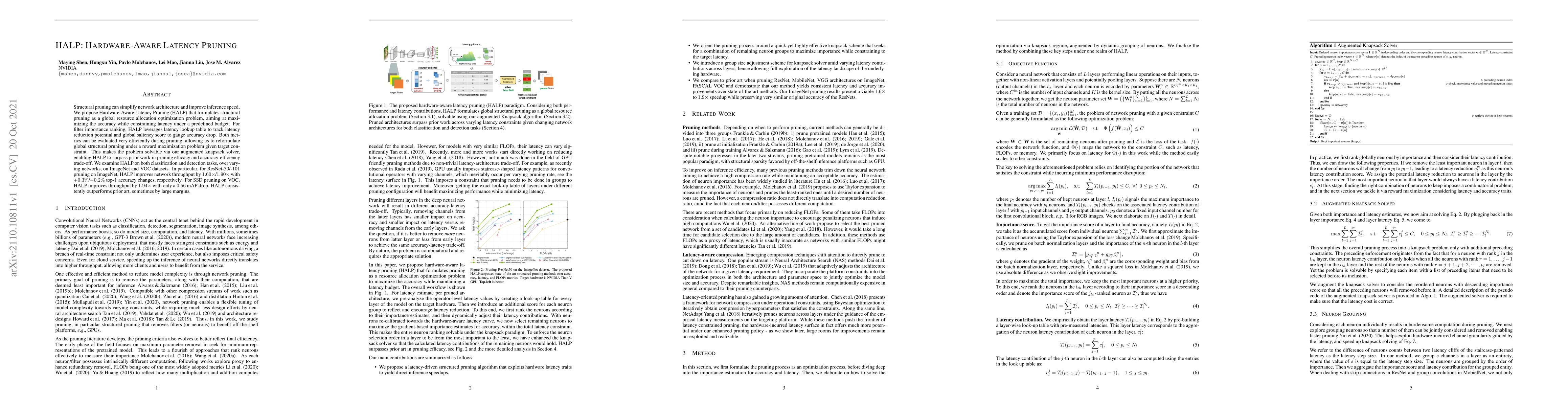 HALP is a novel hardware-aware structural pruning method that optimizes network architecture for improved inference speed while maintaining accuracy within latency constraints. It employs an augmented knapsack solver to efficiently rank filters, achieving better throughput and minimal accuracy loss across various networks and datasets.