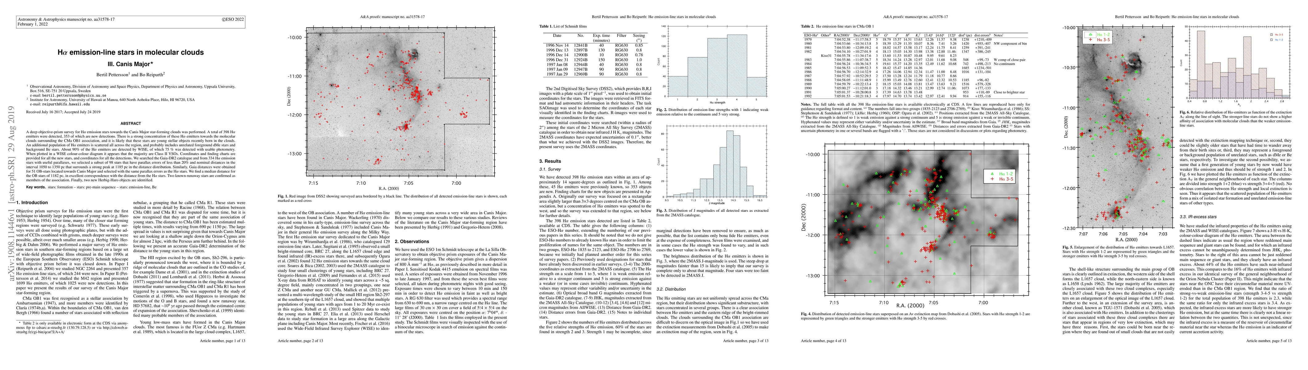 A deep objective-prism survey for H-alpha emission stars towards the Canis Major star-forming clouds was performed. A total of 398 Halpha emitters were detected, 353 of which are new detections. There is a strong concentration of these H-alpha emitters towards the molecular clouds surrounding the CMa~OB1 association, and it is likely that these stars are young stellar objects recently born in the clouds. An additional population of H-alpha emitters is scattered all across the region, and probably includes unrelated foreground dMe stars and background Be stars. About 90% of the H-alpha emitters are detected by WISE, of which 75% was detected with usable photometry. When plotted in a WISE colour-colour diagram it appears that the majority are Class II YSOs. Coordinates and finding charts are provided for all the new stars, and coordinates for all the detections. We searched the Gaia-DR2 catalogue and from 334 Halpha emission stars with useful parallaxes, we selected a subset of 98 stars that have parallax errors of less than 20% and nominal distances in the interval 1050 to 1350 pc that surrounds a strong peak at 1185 pc in the distance distribution. Similarly, Gaia distances were obtained for 51 OB-stars located towards Canis Major and selected with the same parallax errors as the H-alpha stars. We find a median distance for the OB stars of 1182 pc, in excellent correspondence with the distance from the H-alpha stars. Two known runaway stars are confirmed as members of the association. Finally, two new Herbig-Haro objects are identified.