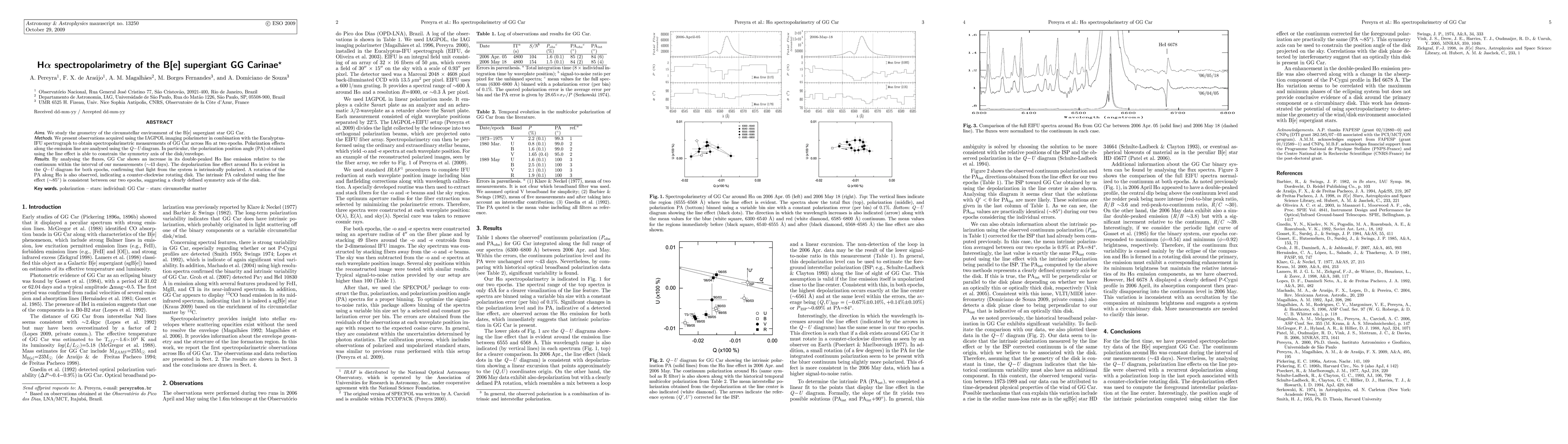 Aims. We study the geometry of the circumstellar environment of the B[e] supergiant star GG Car. Methods. We present observations acquired using the IAGPOL imaging polarimeter in combination with the Eucalyptus-IFU spectrograph to obtain spectropolarimetric measurements of GG Car across Halpha at two epochs. Polarization effects along the emission line are analysed using the Q-U diagram. In particular, the polarization position angle (PA) obtained using the line effect is able to constrain the symmetry axis of the disk/envelope. Results. By analysing the fluxes, GG Car shows an increase in its double-peaked Halpha line emission relative to the continuum within the interval of our measurements (~43 days). The depolarization line effect around Halpha is evident in the Q-U diagram for both epochs, confirming that light from the system is intrinsically polarized. A rotation of the PA along Halpha is also observed, indicating a counter-clockwise rotating disk. The intrinsic PA calculated using the line effect (~85deg) is consistent between our two epochs, suggesting a clearly defined symmetry axis of the disk.