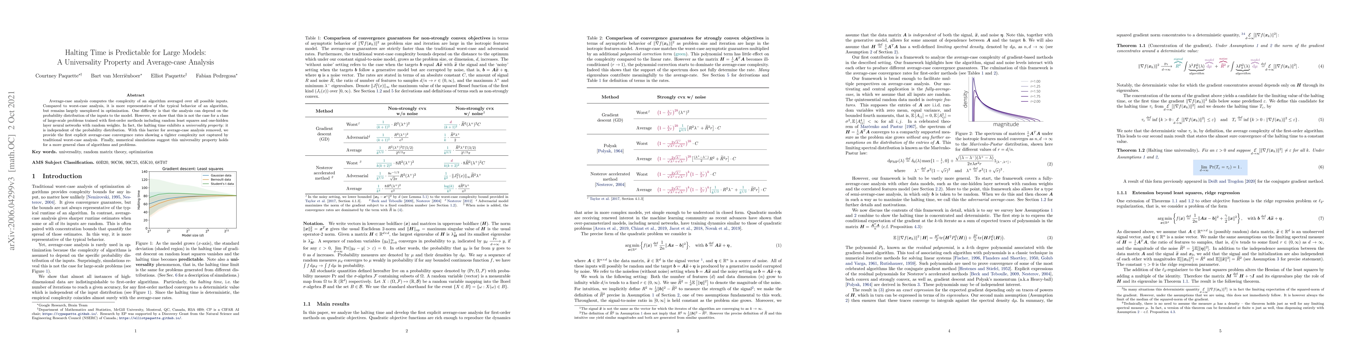 Large-scale models trained with first-order methods exhibit a universality property in their halting time, meaning it's independent of the input probability distribution. This breakthrough enables explicit average-case analysis, providing tighter complexity bounds than traditional worst-case analysis.