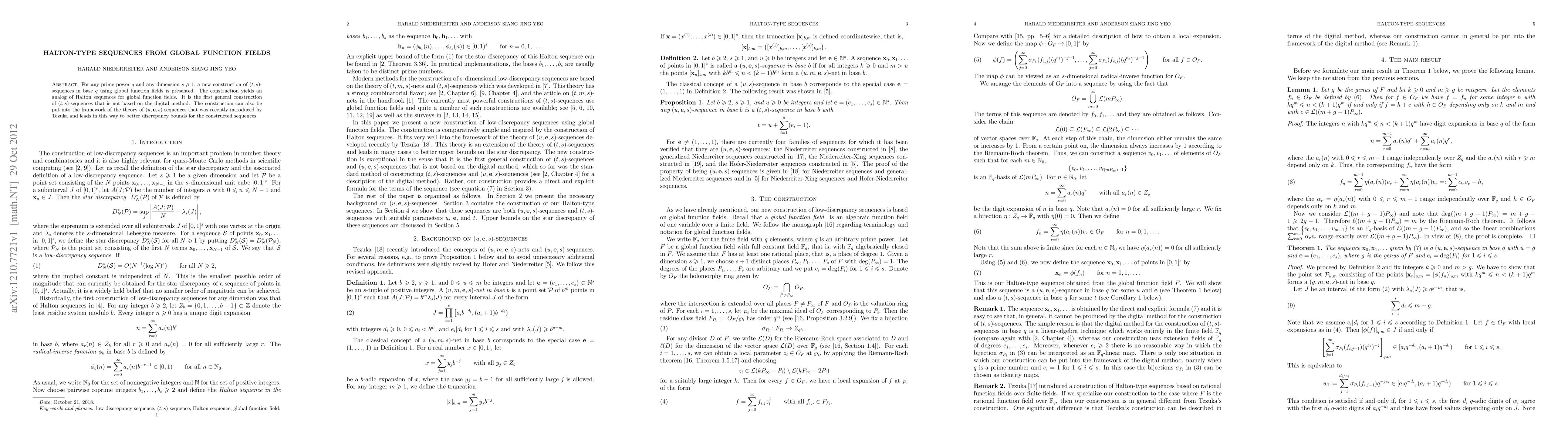 For any prime power $q$ and any dimension $s$, a new construction of $(t,s)$-sequences in base $q$ using global function fields is presented. The construction yields an analog of Halton sequences for global function fields. It is the first general construction of $(t,s)$-sequences that is not based on the digital method. The construction can also be put into the framework of the theory of $(u,e,s)$-sequences that was recently introduced by Tezuka and leads in this way to better discrepancy bounds for the constructed sequences.
