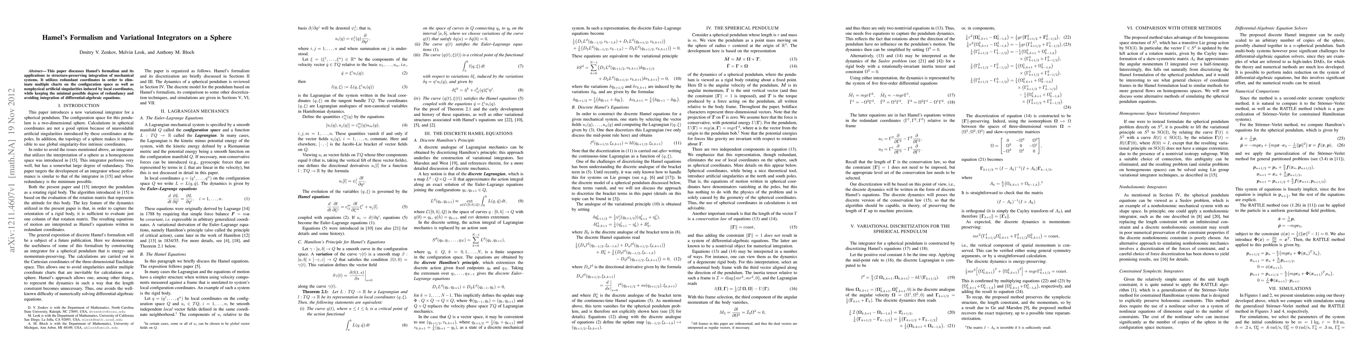 This paper discusses Hamel's formalism and its applications to structure-preserving integration of mechanical systems. It utilizes redundant coordinates in order to eliminate multiple charts on the configuration space as well as nonphysical artificial singularities induced by local coordinates, while keeping the minimal possible degree of redundancy and avoiding integration of differential-algebraic equations.