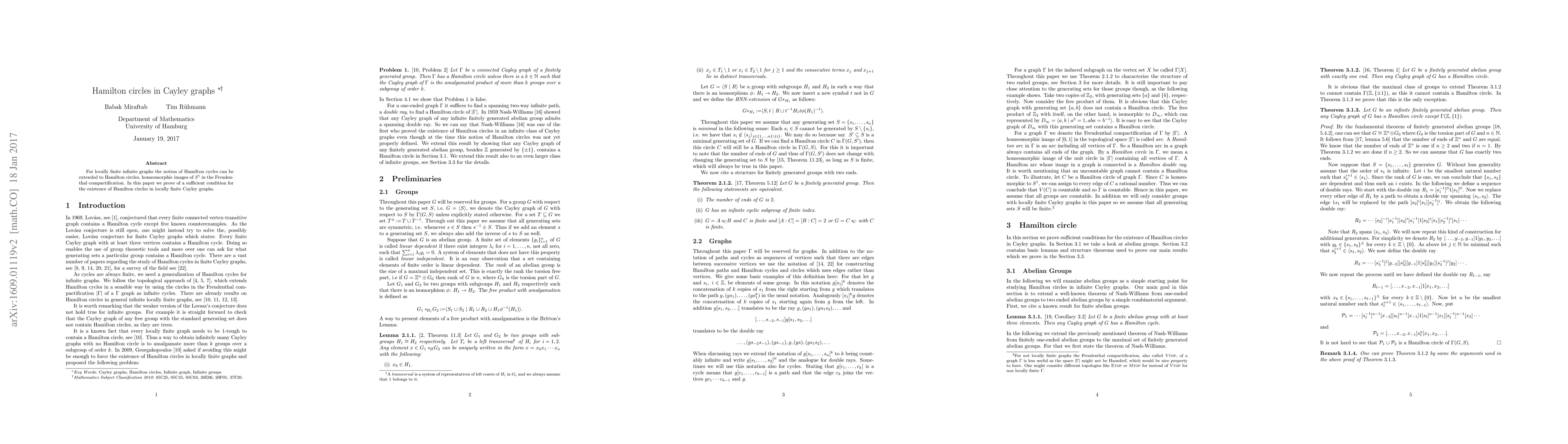 This paper explores Hamilton circles in locally finite infinite graphs, extending the concept of Hamilton cycles. It provides a sufficient condition for the existence of Hamilton circles in locally finite Cayley graphs through the Freudenthal compactification.