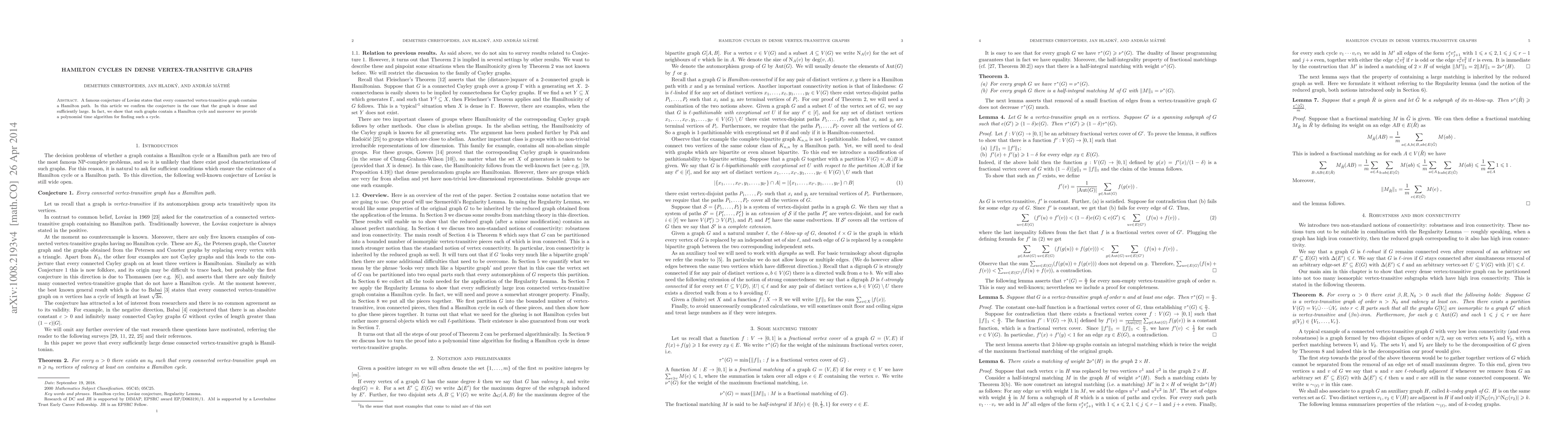 This paper confirms Lovász's conjecture for dense, sufficiently large vertex-transitive graphs by proving the existence of Hamilton cycles and presenting a polynomial time algorithm to find them.