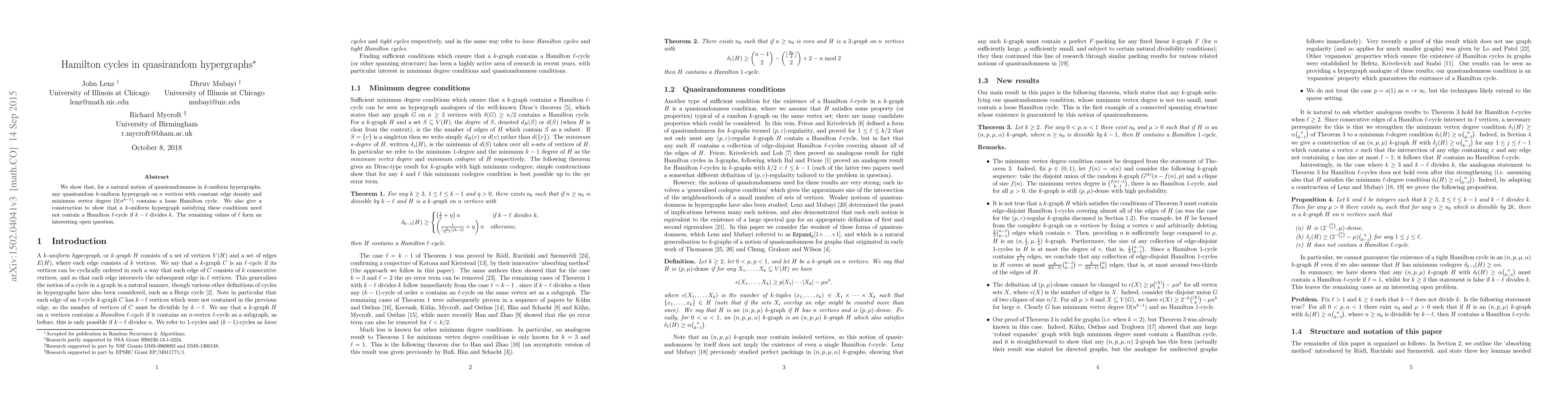 This paper demonstrates that quasirandom $k$-uniform hypergraphs with constant edge density and sufficient minimum vertex degree contain loose Hamilton cycles, while also providing a construction showing that such hypergraphs may lack Hamilton $\ell$-cycles when $k-\ell$ divides $k$, leaving other $\ell$ values an open research question.