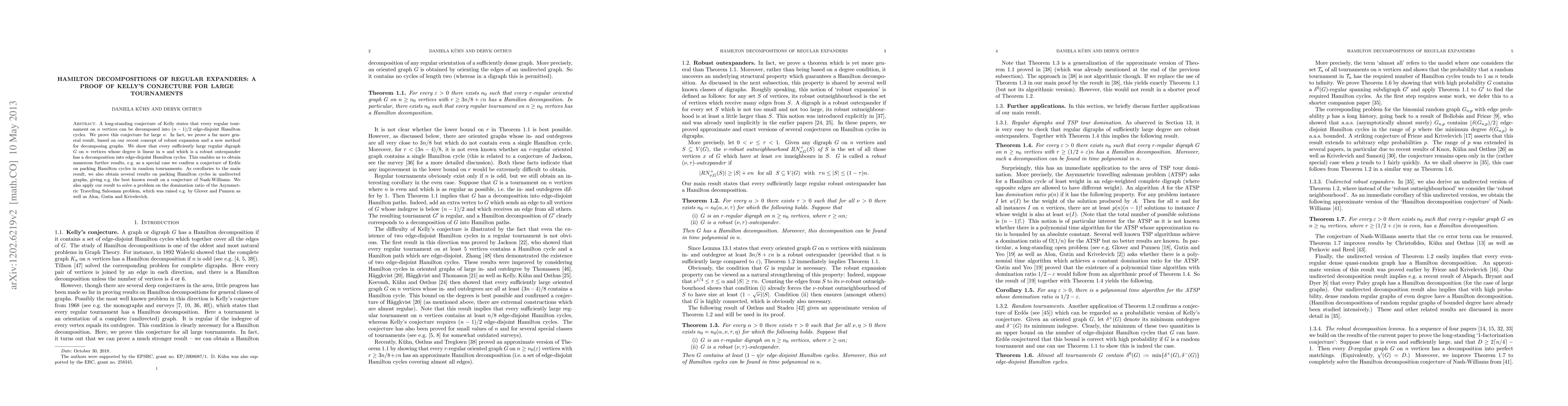 This paper proves Kelly's conjecture for large tournaments by showing that every sufficiently large regular digraph with linear degree and robust expansion can be decomposed into edge-disjoint Hamilton cycles, leading to further results on Hamilton cycle packing in both directed and undirected graphs.