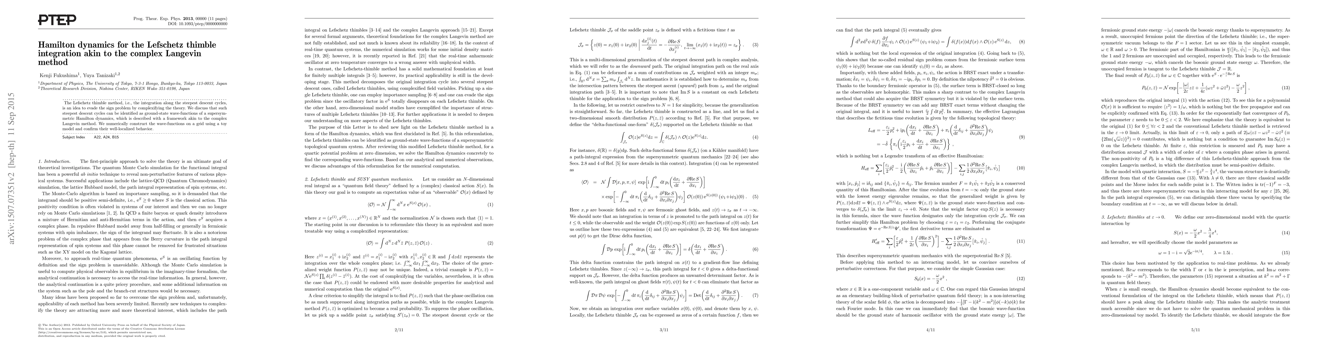 The Lefschetz thimble method, which integrates along steepest descent cycles to avoid sign problems, is shown to correspond to ground-state wave-functions in a supersymmetric Hamilton dynamics similar to the complex Langevin method. Numerical simulations on a toy model confirm the well-localized behavior of these wave-functions.