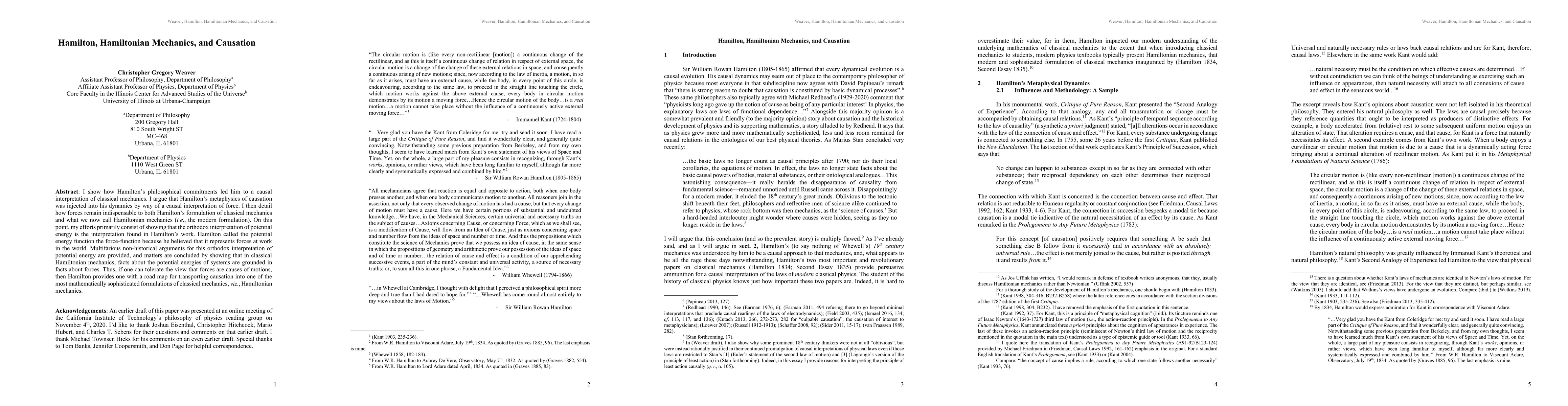 I show how Hamilton's philosophical commitments led him to a causal interpretation of classical mechanics. I argue that Hamilton's metaphysics of causation was injected into his dynamics by way of a causal interpretation of force. I then detail how forces remain indispensable to both Hamilton's formulation of classical mechanics and what we now call Hamiltonian mechanics (i.e., the modern formulation). On this point, my efforts primarily consist of showing that the orthodox interpretation of potential energy is the interpretation found in Hamilton's work. Hamilton called the potential energy function the force-function because he believed that it represents forces at work in the world. Multifarious non-historical arguments for this orthodox interpretation of potential energy are provided, and matters are concluded by showing that in classical Hamiltonian mechanics, facts about potential energies of systems are grounded in facts about forces. Thus, if one can tolerate the view that forces are causes of motions, then Hamilton provides one with a road map for transporting causation into one of the most mathematically sophisticated formulations of classical mechanics, viz., Hamiltonian mechanics.