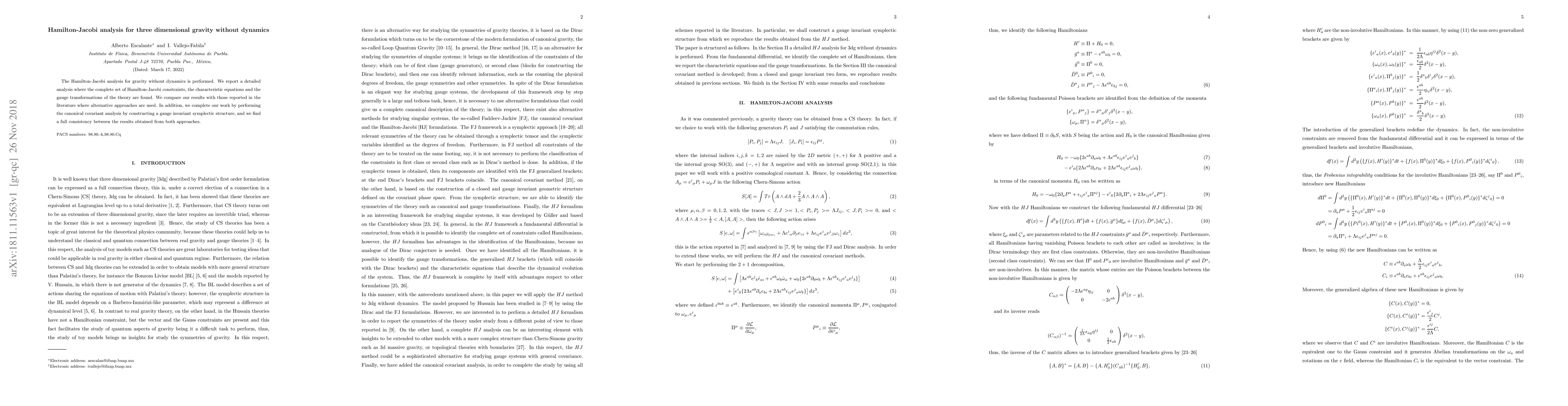 This paper presents a Hamilton-Jacobi analysis for three-dimensional gravity without dynamics, identifying the complete set of constraints and gauge transformations. The results are shown to be consistent with alternative approaches and are complemented by a canonical covariant analysis, confirming full consistency.