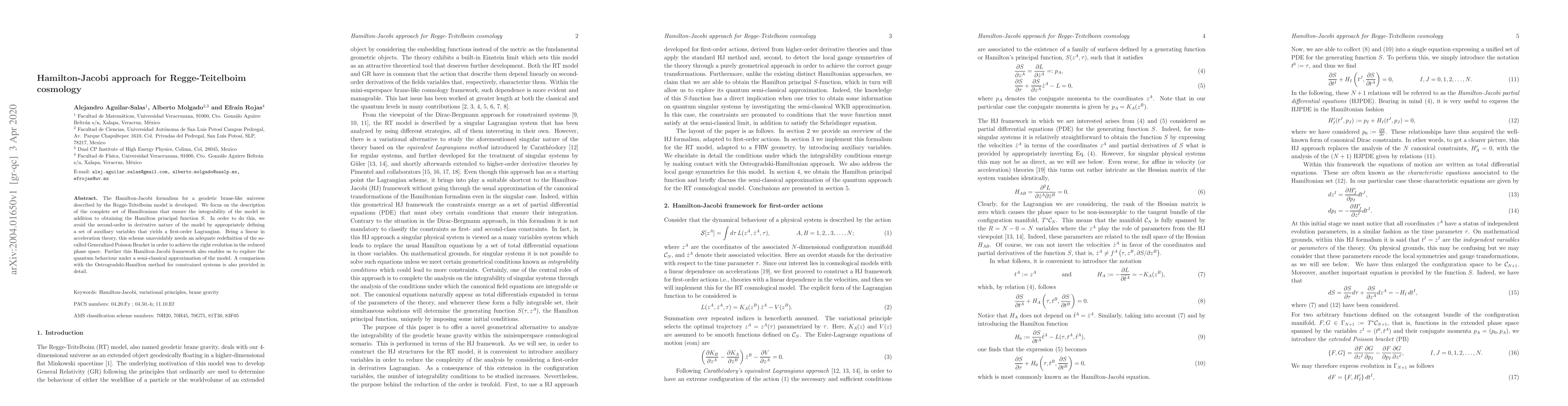 The Hamilton-Jacobi formalism for a geodetic brane-like universe described by the Regge-Teitelboim model is developed. We focus on the description of the complete set of Hamiltonians that ensure the integrability of the model in addition to obtaining the Hamilton principal function $S$. In order to do this, we avoid the second-order in derivative nature of the model by appropriately defining a set of auxiliary variables that yields a first-order Lagrangian. Being a linear in acceleration theory, this scheme unavoidably needs an adequate redefinition of the so-called Generalized Poisson Bracket in order to achieve the right evolution in the reduced phase space. Further this Hamilton-Jacobi framework also enables us to explore the quantum behaviour under a semi-classical approximation of the model. A comparison with the Ostrogradski-Hamilton method for constrained systems is also provided in detail.