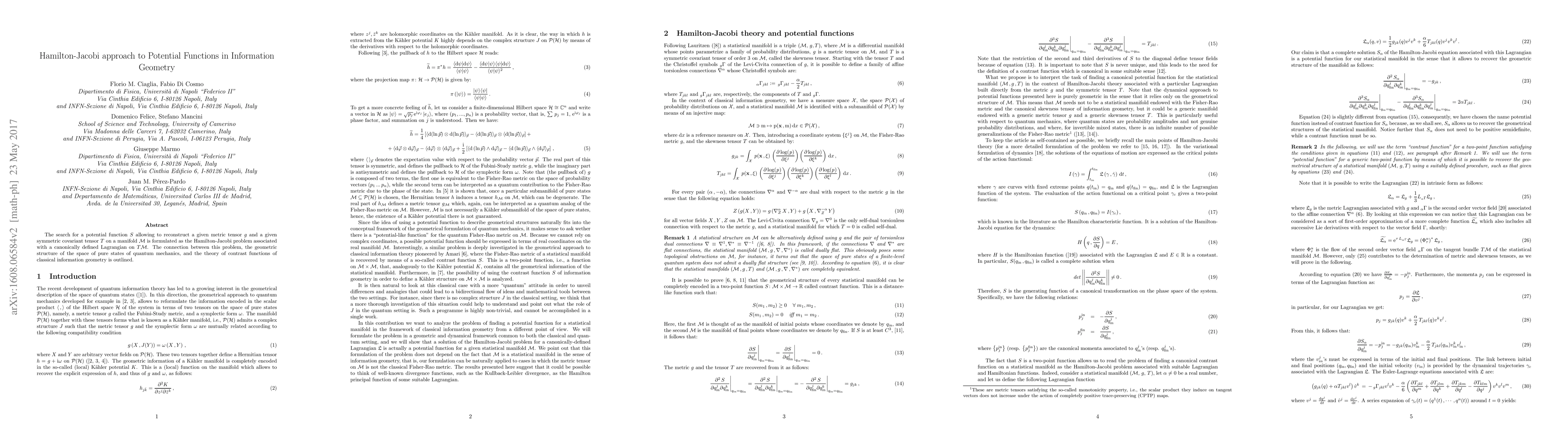 The search for a potential function $S$ allowing to reconstruct a given metric tensor $g$ and a given symmetric covariant tensor $T$ on a manifold $\mathcal{M}$ is formulated as the Hamilton-Jacobi problem associated with a canonically defined Lagrangian on $T\mathcal{M}$. The connection between this problem, the geometric structure of the space of pure states of quantum mechanics, and the theory of contrast functions of classical information geometry is outlined.