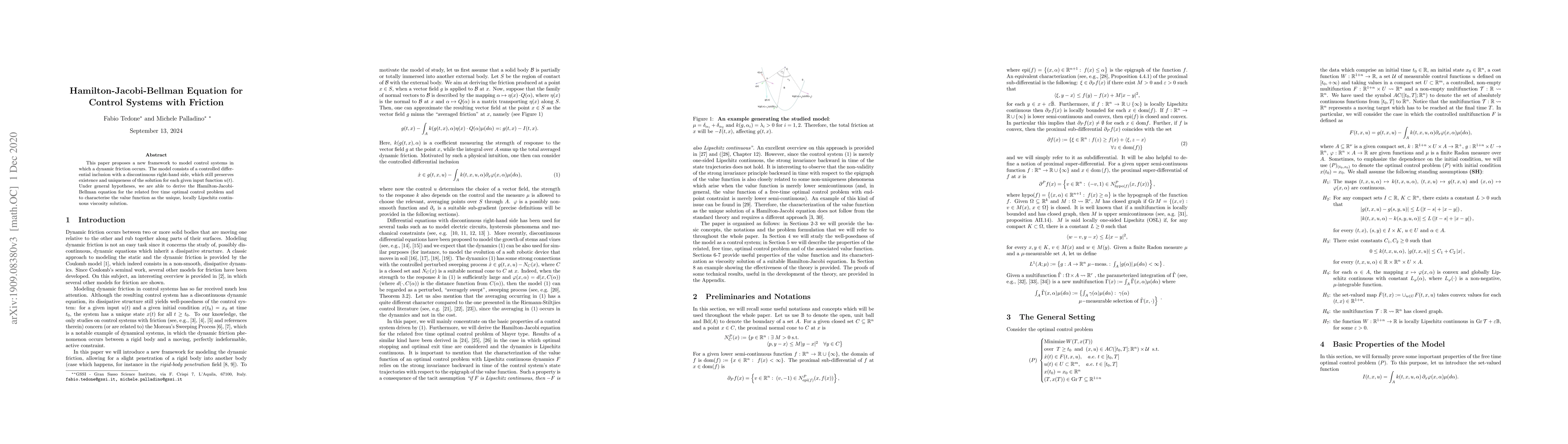 This paper introduces a framework for modeling control systems with dynamic friction, proposing a controlled differential inclusion with a discontinuous right-hand side. It derives the Hamilton-Jacobi-Bellman equation for the optimal control problem and characterizes the value function as a unique, locally Lipschitz continuous viscosity solution.