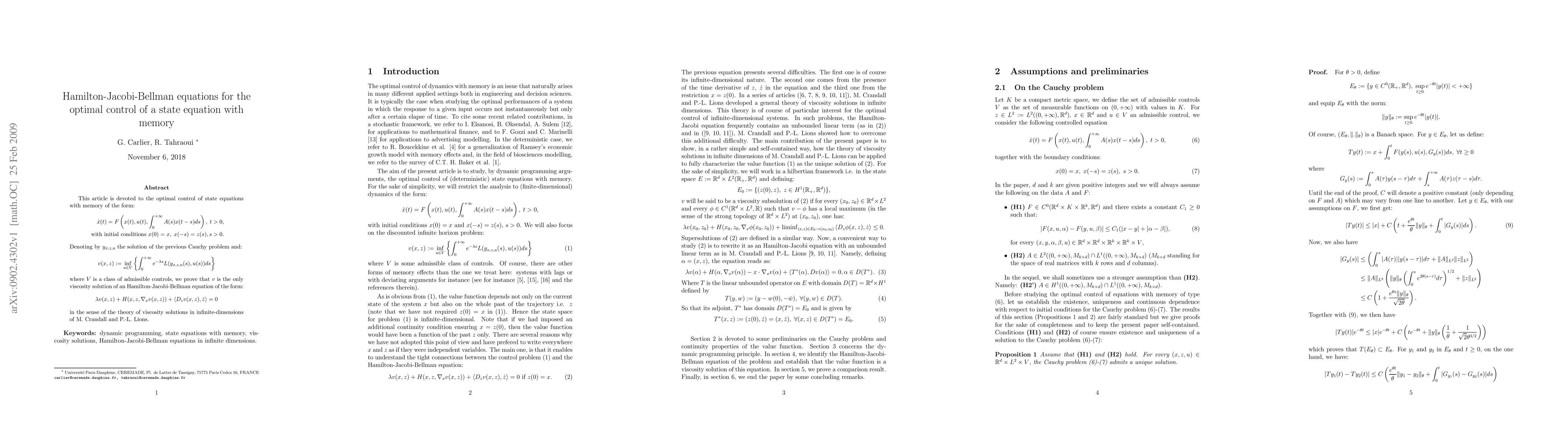 This article is devoted to the optimal control of state equations with memory of the form: ?[x(t) = F(x(t),u(t), \int_0^{+\infty} A(s) x(t-s) ds), t>0, with initial conditions x(0)=x, x(-s)=z(s), s>0.]Denoting by $y_{x,z,u}$ the solution of the previous Cauchy problem and: \[v(x,z):=\inf_{u\in V} \{\int_0^{+\infty} e^{-\lambda s} L(y_{x,z,u}(s), u(s))ds \}\] where $V$ is a class of admissible controls, we prove that $v$ is the only viscosity solution of an Hamilton-Jacobi-Bellman equation of the form: \[\lambda v(x,z)+H(x,z,\nabla_x v(x,z))+D_z v(x,z), \dot{z} >=0\] in the sense of the theory of viscosity solutions in infinite-dimensions of M. Crandall and P.-L. Lions.