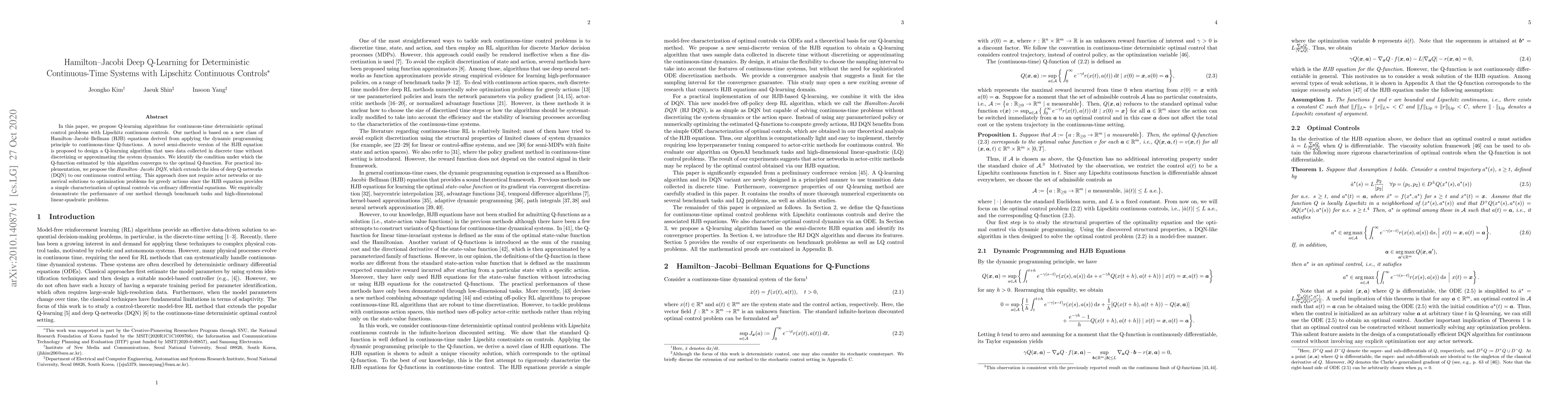 In this paper, we propose Q-learning algorithms for continuous-time deterministic optimal control problems with Lipschitz continuous controls. Our method is based on a new class of Hamilton-Jacobi-Bellman (HJB) equations derived from applying the dynamic programming principle to continuous-time Q-functions. A novel semi-discrete version of the HJB equation is proposed to design a Q-learning algorithm that uses data collected in discrete time without discretizing or approximating the system dynamics. We identify the condition under which the Q-function estimated by this algorithm converges to the optimal Q-function. For practical implementation, we propose the Hamilton-Jacobi DQN, which extends the idea of deep Q-networks (DQN) to our continuous control setting. This approach does not require actor networks or numerical solutions to optimization problems for greedy actions since the HJB equation provides a simple characterization of optimal controls via ordinary differential equations. We empirically demonstrate the performance of our method through benchmark tasks and high-dimensional linear-quadratic problems.